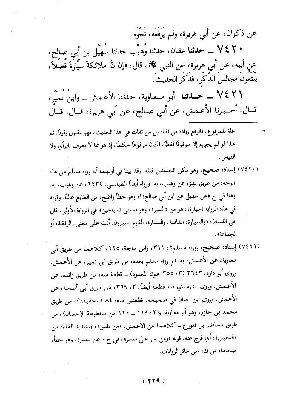 7420 - حدثنا عفان، حدثنا وُهيْب حدثنا سُهَيْل بن أبي صالح، عنِ أبيه، عن أبي هريرة، عن النبي -صلي الله عليه وسلم -، قال: "إن لله ملائكةً سَيَّارَةً فُضُلاً، يَبْتَغُونَ مجالسَ الذِّكْرِ، فذَكَر الحديثَ.
