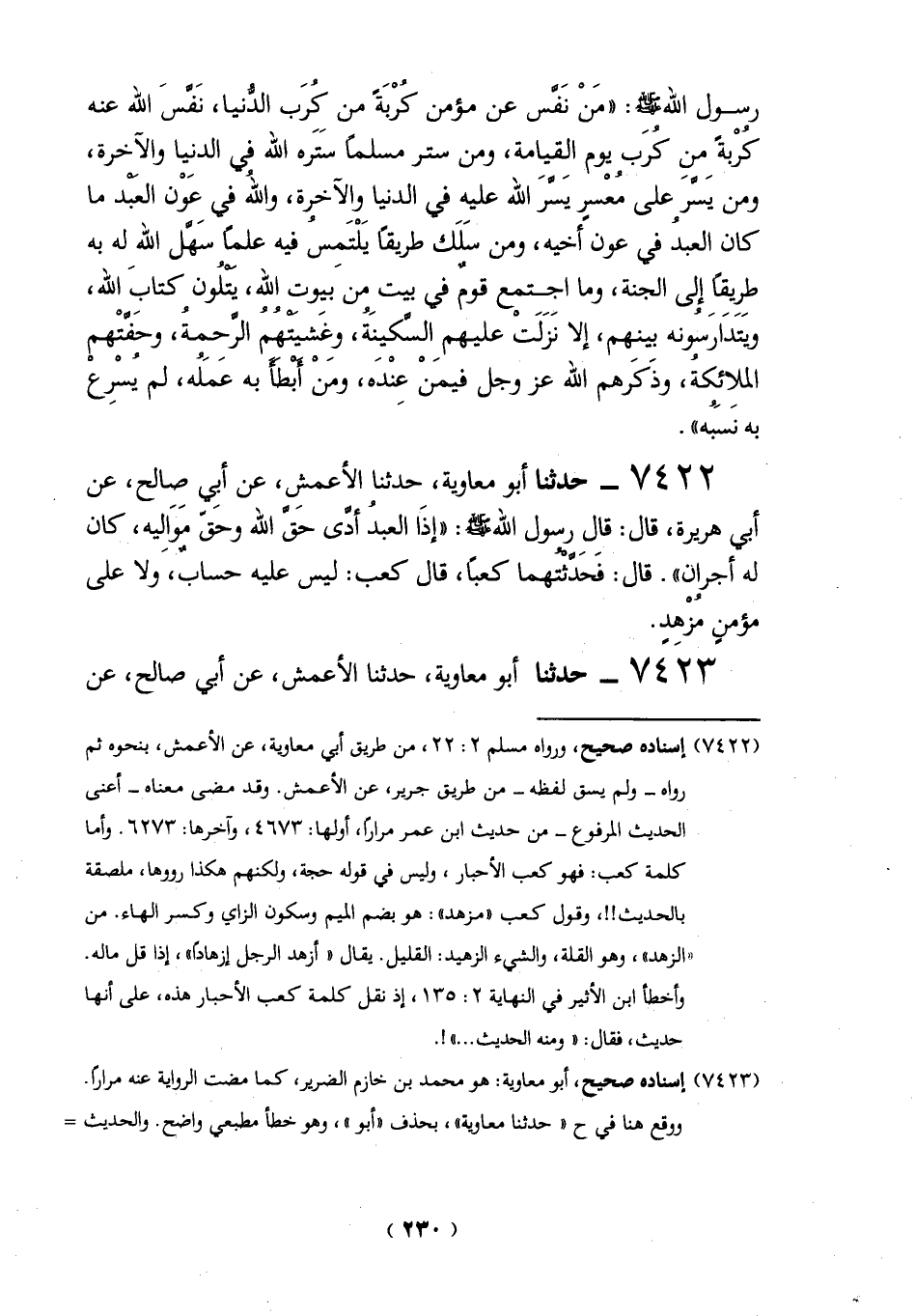 7422 - حدثنا أبو معاوية، حدثنا الأعمش، عن ألِي صالح، عن أبي هريرة، قال: قالِ رمأول الله - صلى الله عليه وسلم -: "إذاً العبدُ أدَّى حَقَّ الله وحَقّ موَاليه، كان له أجران". قال: فَحَدَّثْتُهما كعباً، قال كعب: ليس عليه حسابٌ، ولا على مؤمنٍ مُزهدٍ.
