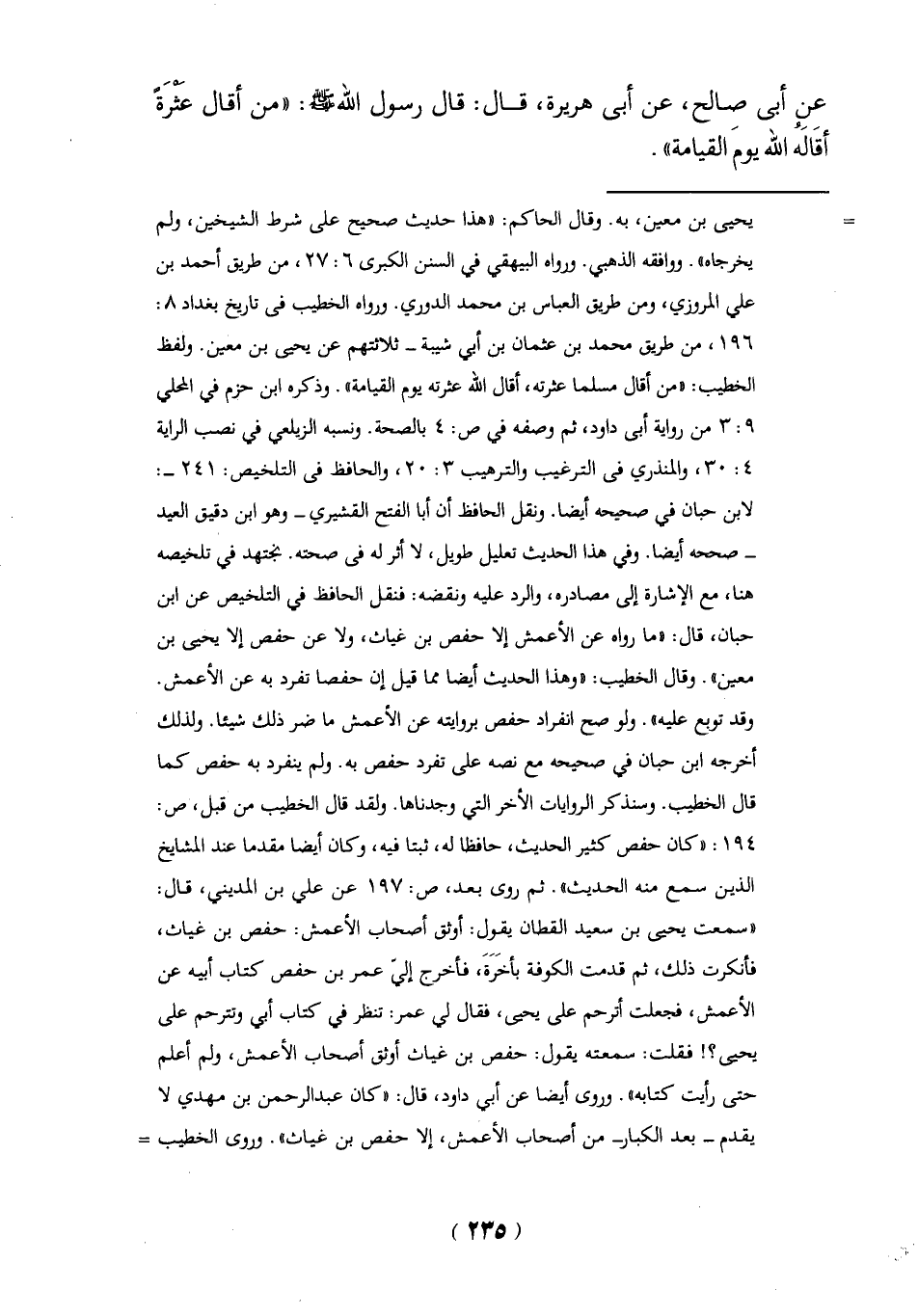 - صححه أيضاً. وفي هذا الحديث تعليل طويل، لا أثر له في صحته. نجتهد في تلخيصه هنا، مع الإشارة إلى مصادره، والرد عليه ونقضه: فنقل الحافظ في التلخيص عن ابن حبان، قال: "ما رواه عن الأعمش إلا حفص بن غياث، ولا عن حفص إلا يحيى بن معين". وقال الخطيب: "وهذا الحديث أيضاً مما قيل إن حفصا تفرد به عن الأعمش.