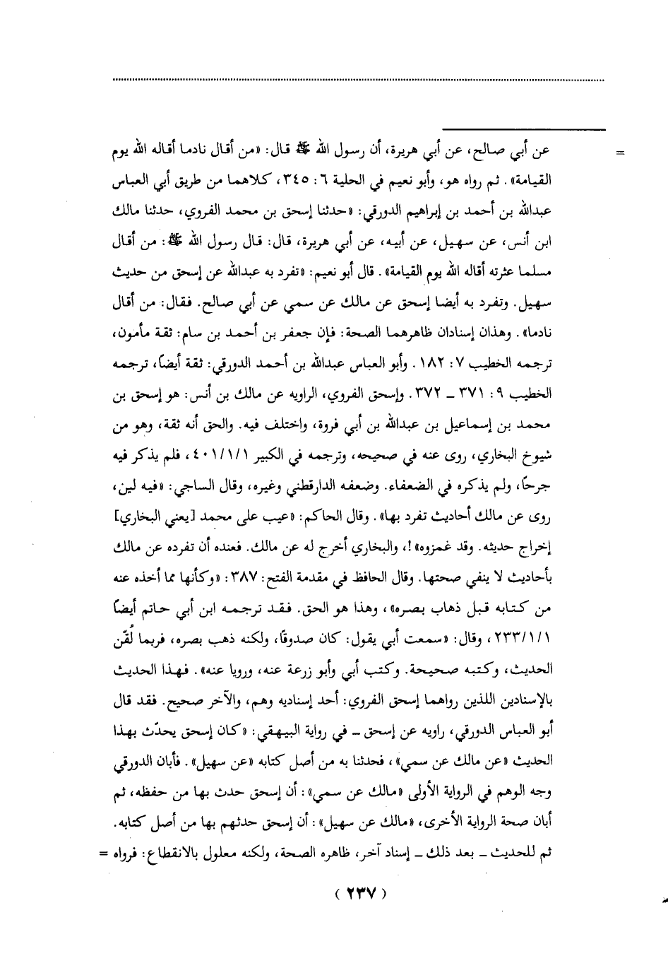 = عن أبي صالح، عن أبي هريرة، أن رسول الله - صلى الله عليه وسلم - قال: "من أقال نادما أقاله الله يوم القيامة". ثم رواه هو، وأبو نعيم في الحلية 6: 345، كلاهما من طريق أبي العباس عبد الله بن أحمد بن إبراهيم الدورقي: "حدثنا إسحق بن محمَّد الفروي، حدثنا مالك ابن أنس، عن سهيل، عن أبيه، عن أبي هريرة، قال: قال رسول الله -صلي الله عليه وسلم -: من "أقال مسلما عثرته أقاله الله يوم القيامة". قال أبو نعيم: "تفرد به عبد الله عن إسحق من حديث سهيل. وتفرد به أيضاً إسحق عن مالك عن سمي عن أبي صالح. فقال: من أقال نادما". وهذان إسنادان ظاهرهما الصحة: فإن جعفر بن أحمد بن سام: ثقة مأمون، ترجمه الخطيب 7: 182. وأبو العباس عبد الله بن أحمد الدورقي: ثقة أيضاً، ترجمه الخطب 9: 371 - 372. وإسحق الفروي، الراويه عن مالك بن أنس: هو إسحق بن محمَّد بن إسماعيل بن عبد الله بن أبي فروة، واختلف فيه. والحق أنه ثقة، وهو من شيوخ البخاري، روى عنه في صحيحه، وترجمه في الكبير1/ 1/401، فلم يذكر فيه جرحًا، ولم يذكره في الضعفاء. وضعفه الدارقطني وغيره، وقال الساجي: "فيه لين، روى عن مالك أحاديث تفرد بها". وقال الحاكم: "عيب على محمَّد [يعني البخاري] إخراج حديثه. وقد غمزوه"!، والبخاري أخرج له عن مالك. فعنده أن تفرده عن مالك بأحاديث لا ينفى صحتها. وقال الحافظ في مقدمة الفتح: 387: "وكأنها مما أخذه عنه من كتابه قبل ذهاب بصره"، وهذا هو الحق. فقد ترجمه ابن أبي حاتم أيضاً 1/ 1/233، وقال: "سمعت أبي يقول: كان صدوقًا، ولكنه ذهب بصره، فربما لُقّن الحديث، وكتبه صحيحة. وكتب أبي وأبو زرعة عنه، ورويا عنه". فهذا الحديث بالإسنادين اللذين رواهما إسحق الفروي: أحد إسناديه وهم، والآخر صحيح. فقد قال أبو العباس الدورقي، راويه عن إسحق - في رواية البيهقي: "كان إسحق يحدّث بهذا الحديث "عن مالك عن سمى"، فحدثنا به من أصل كتابه "عن سهيل". فأبان الدورقي وجه الوهم في الرواية الأولى "مالك عن سمى": أن إسحق حدث بها من حفظه، ثم أبان صحة الرواية الأخرى، "مالك عن سهيل": أن إسحق حدثهم بها من أصل كتابه.