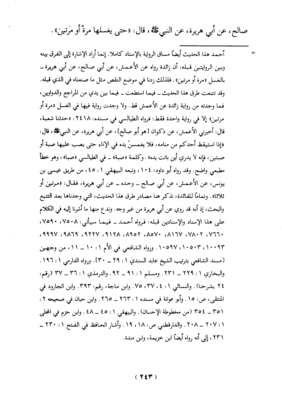 وقد تتبعت طرق هذا الحديث - فيما استطعت - فيما بين يدي من المراجع والدواوين، فما وجدته من رواية زائدة عن الأعمش قط. ولا وجدت رواية فيها في الغسل"مرة أو مرتين" إلا في رواية واحدة فقط: فرواه الطيالسي في مسنده: 2418: "حدثنا شُعبة، قال: أخبرني الأعمش، عن ذكوان [هو أبو صالح]، عن أبي هريرة، عن النبي -صلي الله عليه وسلم -، قال: "إذا استيقظ أحدكم من منامه، فلا يغمسنّ يده في الإناء حتى يصب عليها صبة أو صبتين، فإنه لا يدري أين باتت يده". وكلمة "صبة" - في الطيالسي "صبا"، وهو خطأ مطبعي واضح. وقد رواه أبو داود: 104، وتبعه البيهقي 1: 45، من طريق عيسى بن يونس، عن الأعمش، عن أبي صالح - وحده - عن أبي هريرة، فقال: "مرتين أو