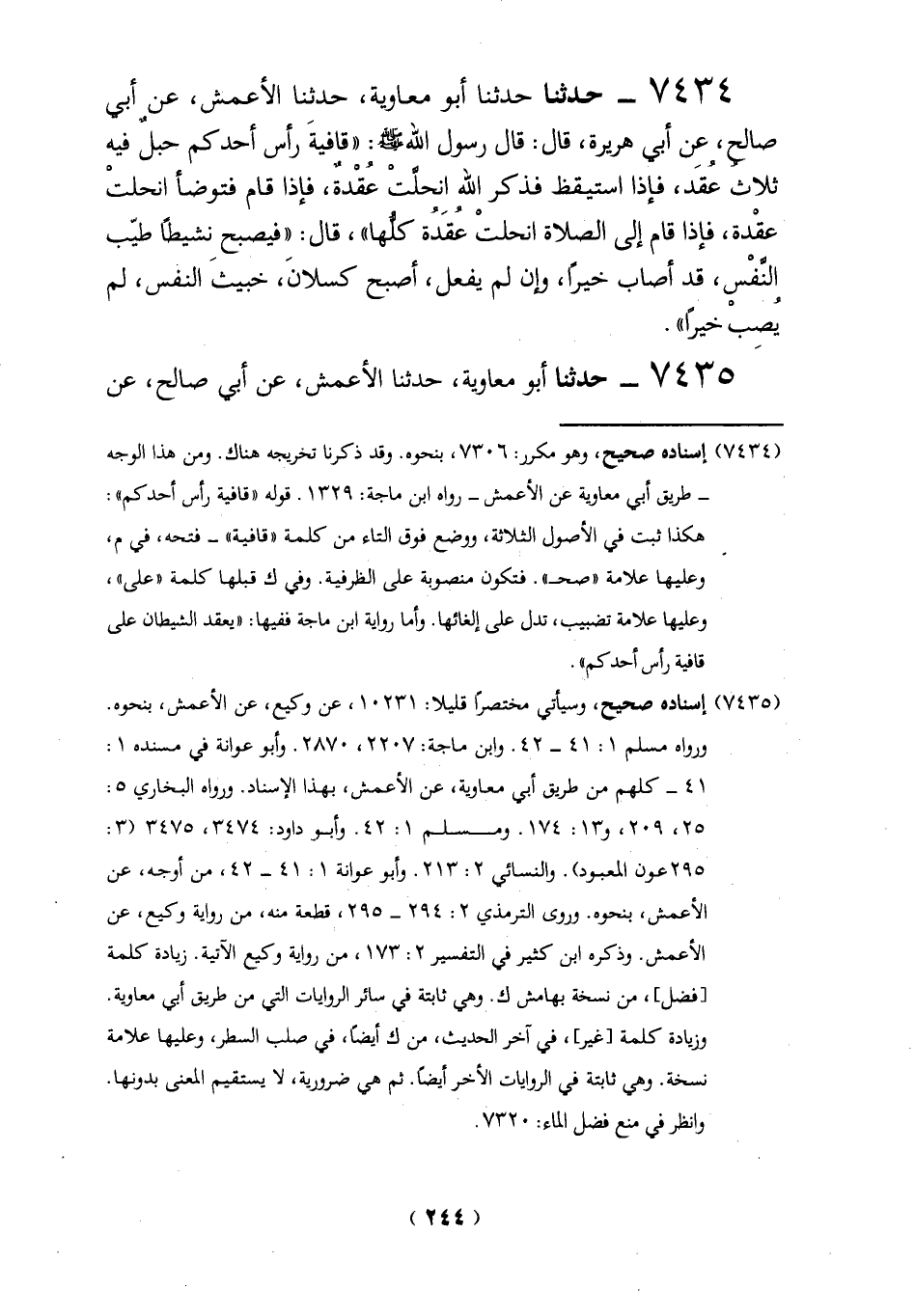 7434 - حدثنا حدثنا أبو معاوية، حدثنا الأعمش، عن أبي صالح، عن أبي هريرة، قال: قال رسول الله - صلي الله عليه وسلم -: "قافيةَ رأس أحدكم حبلٌ فيه ثلاث عُقَد، فإذا استيقظ فذكر الله انحلَّتْ عُقْدةٌ، فإذا قام فتوضأ انحلتْ عقْدة، فإذا قام إلى الصلاة انحدتْ عُقَدُة كلُّها"، قال: "فيصبح نشيطاً طيّب النَّفْس، قد أصاب خيراً، وإن لم يفعل، أصبح كسلانَ، خبيثَ النفس، لم يُصِبْ خيراً".