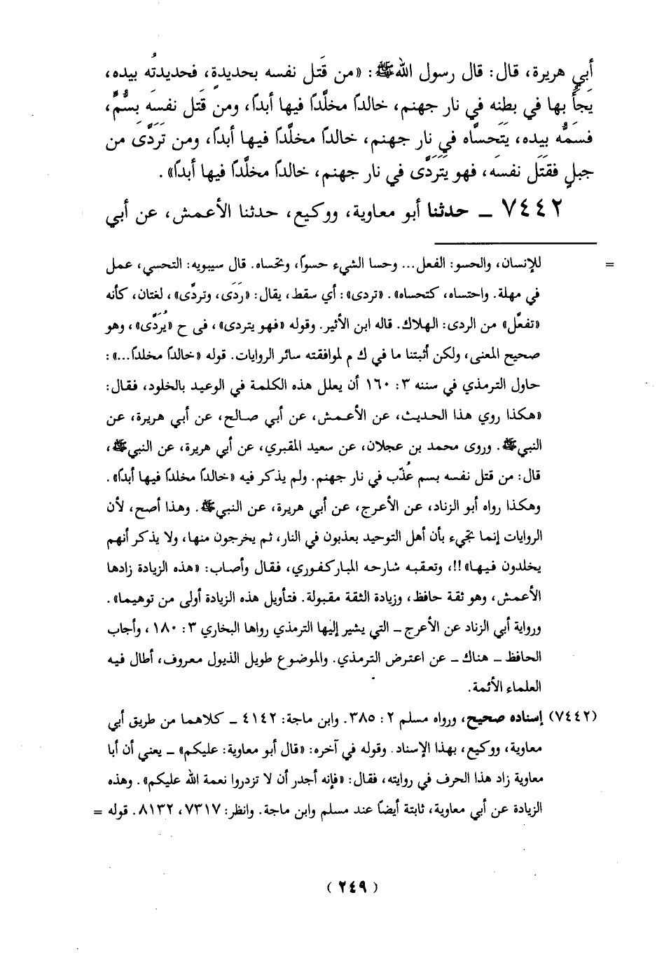 = للإنسان، والحسو: الفحل ... وحسا الشيء حسوًا، وتحساه. قال سيبويه: التحسي، عمل في مهلة. واحتساه، كتحساه". "تردى": أي سقط، يقال: "رَدَى، وتردّى"، لغتان، كأنه "تفعّل" من الردى: الهلاك. قاله ابن الأثير. وقوله "فهو يتردى"، في ح "يُرَدَّى"، وهو صحيح المعنى، ولكن أثبتنا ما في ك م لموافقته سائر الروايات. قوله "خالدًا مخلدًا ... : حاول الترمذي في سننه 3: 160 أن يعلل هذه الكلمة في الوعيد بالخلود، فقال: "هكذا روي هذا الحديث، عن الأعمش، عن أبي صالح، عن أبي هريرة، عن النبي -صلي الله عليه وسلم -. وروى محمَّد بعجلان، عن سعيد المقبري، عن أبي هريرة، عن النبي -صلي الله عليه وسلم -، قال: من قتل نفسه بسم عُذّب في نار جهنم. ولم يذكر فيه "خالدًا مخلد، فيها أبدًا".
