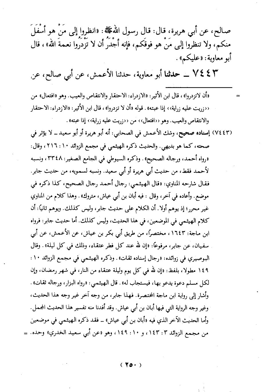 صالح، عن أبي هريرة، قال: قال رسول الله -صلي الله عليه وسلم -: "انظِروِا إلى مَنْ هو أسْفَلَ منكم، ولا تنظروا إلى منْ هو فوقَكم، فإنه أجْدَرُ أن لا تزْدرُوا نعمةَ الله"، قال أبو معاوية: "عليكم".