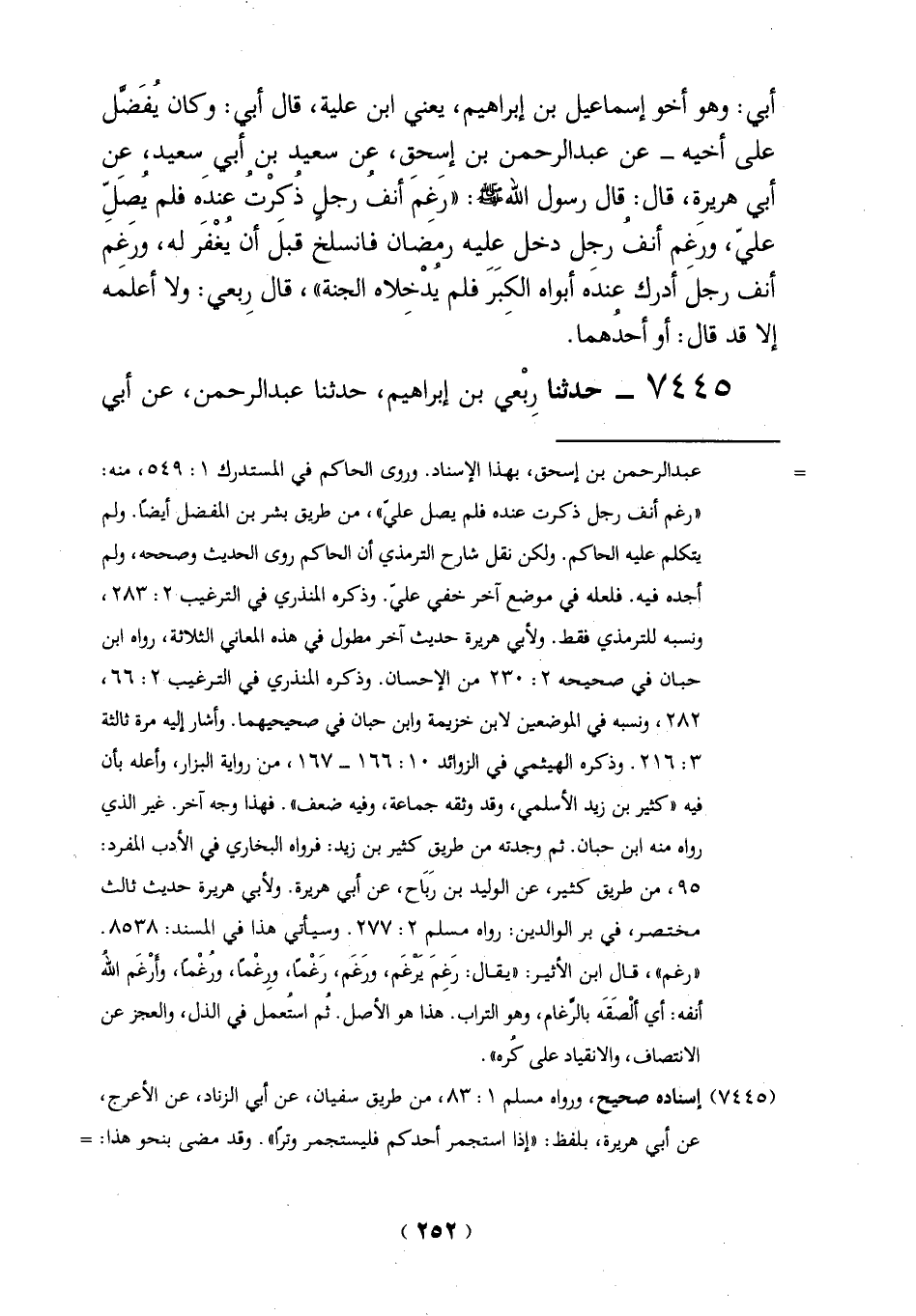 أبي: وهو أخو إسماعيل بن إبراهيم، يعني ابن علية، قال أبي: وكان يُفَضَّل على أخيه - عن عبد الرحمن بن إسحق، عن سعيد بن أبي سعيد، عن أبي هريرة، قال: قال رسول الله -صلي الله عليه وسلم -: "رَغِمَ أَنْفُ رَجُلٍ ذُكِرْتُ عِنْدَهُ فَلَمْ يُصَلِّ عَلَيَّ، وَرَغِمَ أَنْفُ رَجُلٍ دَخَلَ عَلَيْهِ رَمَضَانُ فَانْسَلَخَ قَبْلَ أَنْ يُغْفَرَ لَهُ، وَرَغِمَ أَنْفُ رَجُلٍ أَدْرَكَ عِنْدَهُ أَبَوَاهُ الْكِبَرَ فَلَمْ يُدْخِلاَهُ الْجَنَّةَ". قَالَ رِبْعِيٌّ: وَلاَ أَعْلَمُهُ