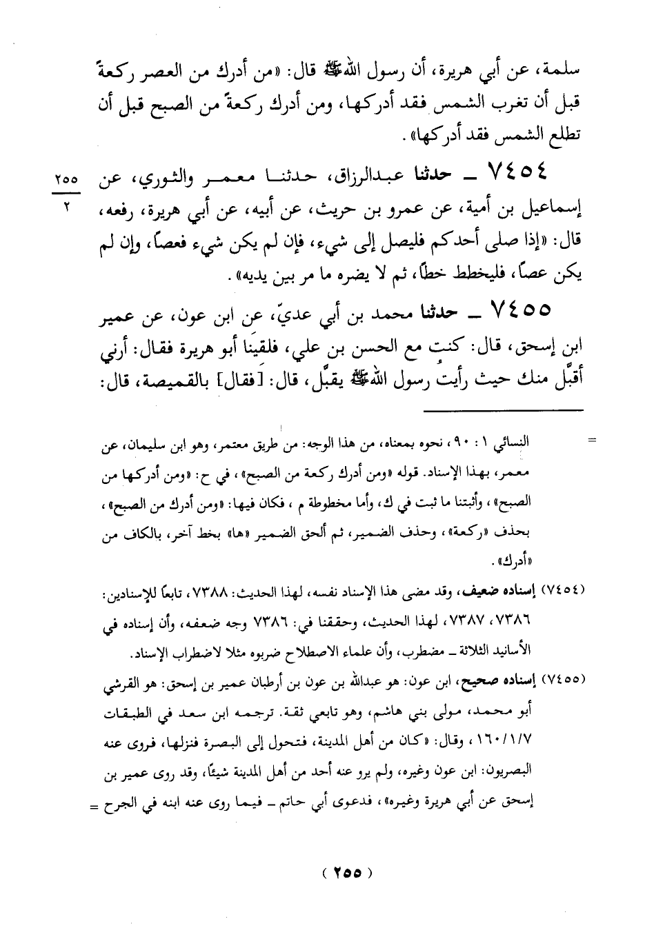 (7445) إسناده صحيح، ابن عون: هو عبد الله بن عون بن أرطبان عمير بن إسحق: هو القرشي أبو محمَّد، مولى بني هاشم، وهو تابعي ثقة. ترجمه ابن سعد في الطبقات 7/ 1/160، وقال: "كان من أهل المدينة، فتحول إلى البصرة فنزلها، فروى عنه البصريون: ابن عون وغيره، ولم يرر عنه أحد من أهل المدينة شيئًا، رقد روى عمير بن إسحق عن أبي هريرة وغيره"، فدعوى أبي حاتم - فيما روى عنه ابنه في الجرح =