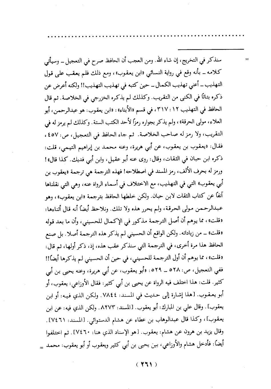 = سنذكر في التخريج، إن شاء الله. ومن العجب أن الحافظ شرح في التعجيل - وسيأتي كلامه- بأنه وقع في رواية النسائي "ابن يعقوب"، ومع ذلك فلم يعقب على قول التهذيب- أعنى تهذيب الكمال- حين كتبه في تهذيب التهذيب!! ولكنه أعرض عن ذكره بتاتًا في الكنى من التقريب. وكذلك لم يذكره الخزرجي في الخلاصة. ثم قال الحافظ في التهذيب 12: 317، في قسم "الأبناء": "ابن يعقوب: هو عبد الرحمن، أبو العلاء، مولى الحرقة"، ولم يذكر بجواره رمزًا لأحد الكتب الستة. وكذلك لم يرمز له في التقريب، ولا رمز له صاحب الخلاصة. ثم جاء الحافظ في التعجيل، ص: 457، فقال: "يعقوب بن يعقوب، عن أبي هريرة، وعنه محمَّد بن إبراهيم التيمي، قلت: ذكره ابن حبان في الثقات، وقال: روى عنه أبو عقيل، وابن أبي فديك. كذا قال"! ورمز له جرف الألف، رمز المسند في اصطلاحه! فهذه الترجمة هي ترجمة "يعقوب بن أبي يعقوب" التي في التهذيب، مع الاختلاف في أسماء الرواة عنه، وهي التي نقلناها آنفًا عن كتاب الثقات لابن حبان. ولكن خلها الحافظ بترجمة "ابن يعقوب"، وهو عبد الرحمن مولى الحرقة، ولم يحرر هذه ولا تلك. ونلاحظ أيضاً أنه قال أثناءها: "قلت"، مما يوهم أن أصل الترجمة مذكور في الإكمال للحسيني، وأن ما بعد قوله "قلت"- من زياداته. ولكن الواقع أن الحسيني لم يذكر هذه الترجمة أصلاً. بل صنع الحافظ هذا مرة أخرى، في الترجمة التي سنذكر عقب هذه، إذ، ذكر أولها، ثم قال: "قلت"، مما يرهم أن أول الترجمة للحسيني، في حين أن الحسيني لم يذكرها أيضاً!!