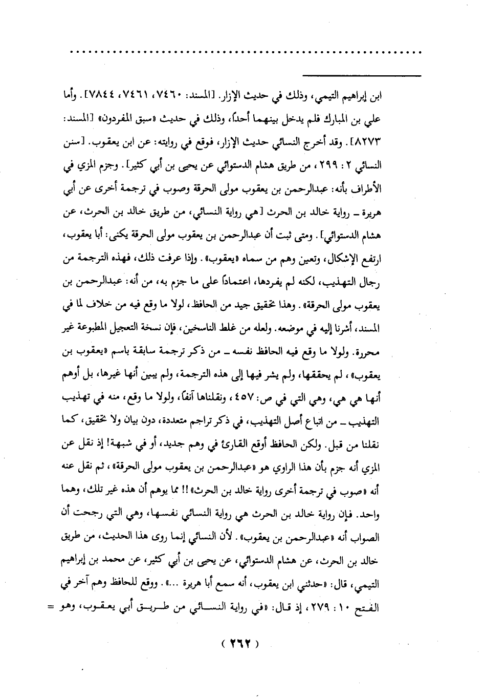 ابن إبراهيم التيمي، وذلك في حديث الإزار. [المسند: 7460، 7461، 7844]. وأما علي بن المبارك فلم يدخل بينهما أحداً، وذلك في حديث "سبق المفردون" [المسند: 8273]. وقد أخرج النسائي حديث الإزار، فوقع في روايته: عن ابن يعقوب. [سنن النسائي 2: 299، من طريق هشام الدستوائي عن يحيى بن أبي كثير]. وجزم المزي في الأطراف بأنه: عبد الرحمن بن يعقوب مولى الحرقة وصوب في ترجمة أخرى عن أبي هريرة - رواية خالد بن الحرث [هي رواية النسائي، من طريق خالد بن الحرث، عن هشام الدستوائي]. ومتى ثبت أن عبد الرحمن بن يعقوب مولى الحرقة يكنى: أبا يعقوب، ارتفع الإشكال، وتعين وهم من سماه "يعقوب". وإذا عرفت ذلك، فهذه الترجمة من رجال التهذيب، لكنه لم يفردها، اعتمادًا، على ما جزم به، من أنه: عبد الرحمن بن يعقوب مولى الحرقة". وهذا تحقيق جيد من الحافظ، لولا ما وقع فيه من خلاف لما في المسند، أشرنا إليه في موضعه. ولحله من غلط الناسخين، فإن نسخة التعجيل المطبوعة غير محررة. ولولا ما وقع فيه الحافظ نفسه - من ذكر ترجمة سابقة باسم "يعقوب بن يعقوب"، لم يحققها، ولم يشرفيها إلى هذه الترجمة، ولم يبين أنها غيرها، بل أوهم أنها هي هي، وهي التي في ص: 457، ونقلناها آنفًا، ولولا ما وقع، منه في تهذيب