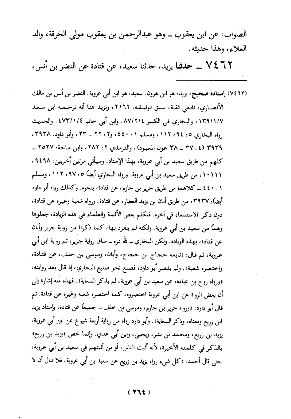 (7462) إسناده صحيح، يزيد: هو ابن هرون. سعيد: هو ابن أبي عروبة. النضر بن أنس بن مالك الأنصاري: تابعي ثقة، سبق توثيقه: 2162، ونزيد هنا أنه ترجمه ابن سعد 7/ 1/139، والبخاري في الكبير 4/ 2/ 87. وابن أبي حاتم 4/ 1/ 473. والحديث رواه البخاري 5: 94، 112، ومسلم 1: 440، و2: 22 - 23، وأبو داود: 3938، 3939 (4: 37 - 38 عون المعبود)، والترمذي 2: 282، وابن ماجة: 2527 - كلهم من طريق سعيد بن أبي عروبة، بهذا الإ إسناده. وسيأتي مرتين أخريين: 9498، 10111، من طريق سعيد بن أبي عروبة. ورواه البخاري أيضاً 5: 97، 112، ومسلم 1: 440 - كلاهما من طريق جرير بن حازم، عن قتادة، بنحوه. وكذلك رواه أبو داود أيضاً: 3937، من طريق أبان بن يزيد العطار، عن قتادة. ورواه شُعبة وغيره عن قتادة،