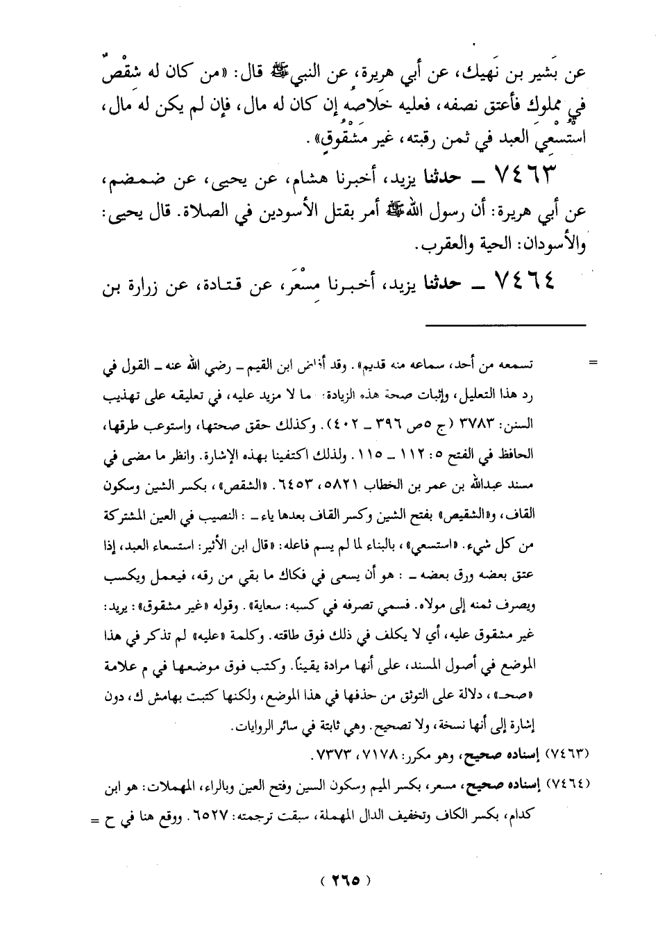(7464) إسناده صحيح، مسعر، بكسر الميم وسكون السين وفتح العين وبالراء، المهملات: هو ابن كدام، بكسر الكاف وتخفيف الدال المهملة، سبقت ترجمته: 6527. ووقع هنا في ح =