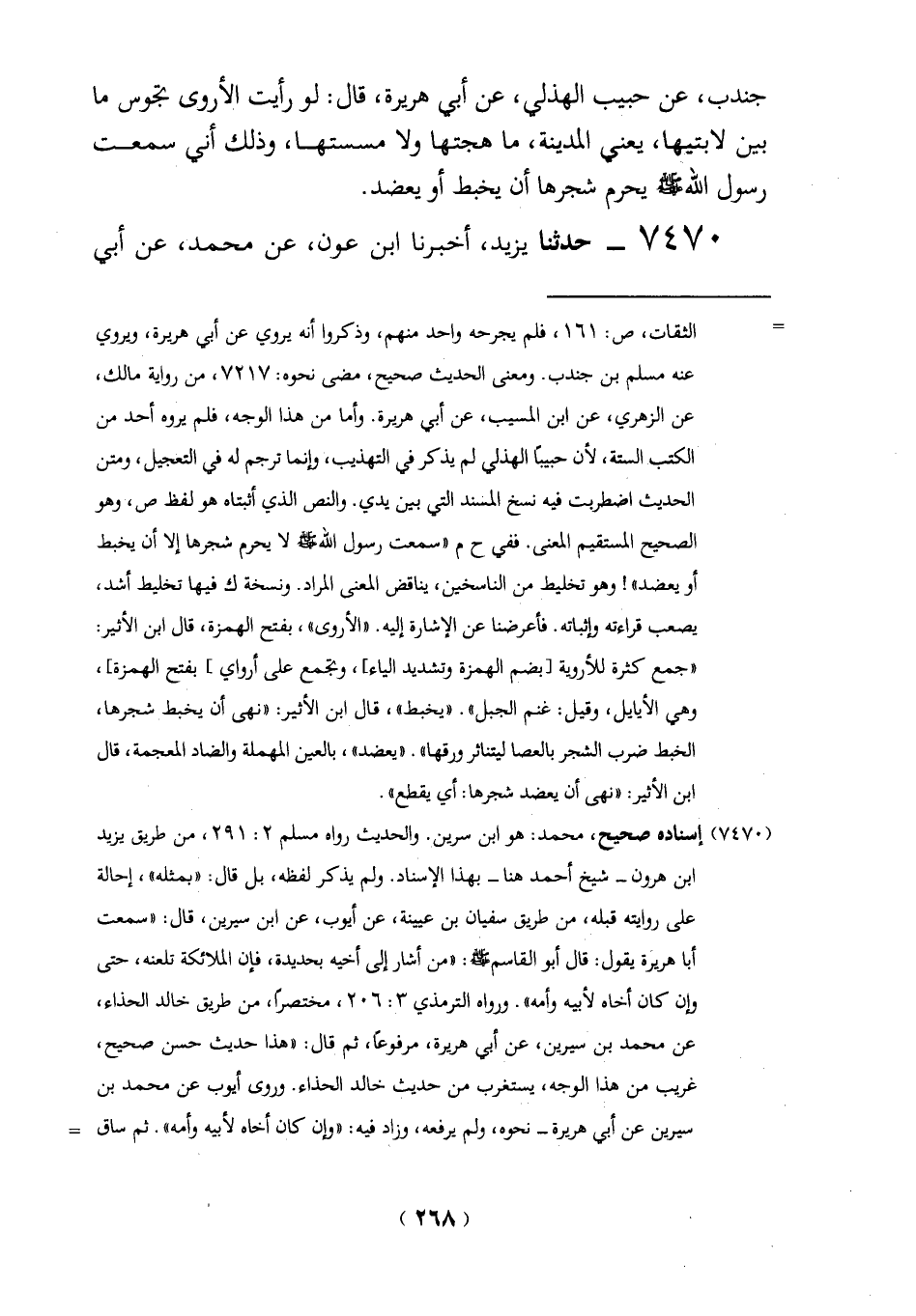 = الثقات، ص1061، فلم يجرحه واحد منهم، وذكروا أنه يروي عن أبي هريرة، ويروي عنه مسلم بن جندب. ومعنى الحديث صحيح، مضى نحوه: 7217، من رواية مالك، عن الزهري، عن ابن المسيب، عن أبي هريرة. وأما من هذا الوجه، فلم يروه أحد من الكتب الستة؛ لأن حبيبًا الهذلي لم يذكر في التهذيب، وإنما ترجم له في التعجيل، ومتن الحديث اضطربت فيه نسخ المسند التي بين يدي. والنص الذي أثبتناه هو لفظ ص، وهو الصحيح المستقيم المعنى. ففي ح م "سمعت رسول الله - صلى الله عليه وسلم - لا يحرم شجرها إلا أن يخبط أو يعضد"! وهو تخليط من الناسخين، يناقض المعنى المراد. ونسخة ك فيها تخليط أشد، يصعب قراءته وإثباته. فأعرضنا عن الإشارة إليه. "الأروى"، بفتح الهمزة، قال ابن الأثير: "جمع كثرة للأروية [بضم الهمزة وتشديد الياء]، وتجمع على أرواي، بفتح الهمزة]، وهي الأيايل، وقيل: غنم الجبل". "يخبط"، قال ابن الأثير: "نهى أن يخبط شجرها، الخبط ضرب الشجر بالعصا ليتناثر ورقها". "يعضد"، بالعين المهملة والضاد المعجمة، قال ابن الأثير: "نهى أن يعضد شجرها: أي يقطع".
