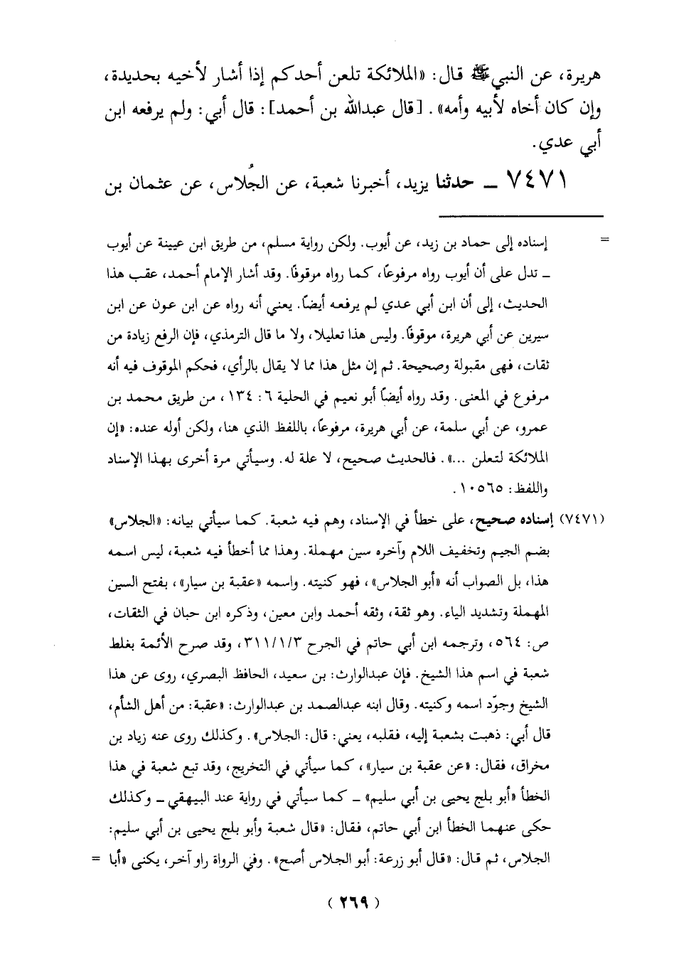 = إسناده إلى حمّاد بن زيد، عن أيوب. ولكن رواية مسلم، من طريق ابن عيينة عن أيوب - تدل على أن أيوب رواه مرفوعاً، كما رواه مرقوفاً. وقد أشار الإِمام أحمد، عقب هذا الحديث، إلى أن ابن أبي عدي لم يرفعه أيضاً. يعني أنه رواه عن ابن عون عن ابن سيرين عن أبي هريرة، موقوفًا. وليس هذا تعليلا، ولا ما قال الترمذي، فإن الرفع زيادة من ثقات، فهي مقبولة وصحيحة. ثم إن مثل هذا مما لا يقال بالرأي، فحكم الموقوف فيه أنه مرفوع في المعنى. وقد رواه أيضاً أبو نعيم في الحلية 6: 134، من طريق محمَّد بن عمرو، عن أبي سلمة، عن أبي هريرة، مرفوعًا، باللفظ الذي هنا، ولكن أوله عنده: "إن الملائكة لتعلن ... ". فالحديث صحيح، لا علة له. وسيأتي مرة أخرى بهذا الإِسناد واللفظ:10565.