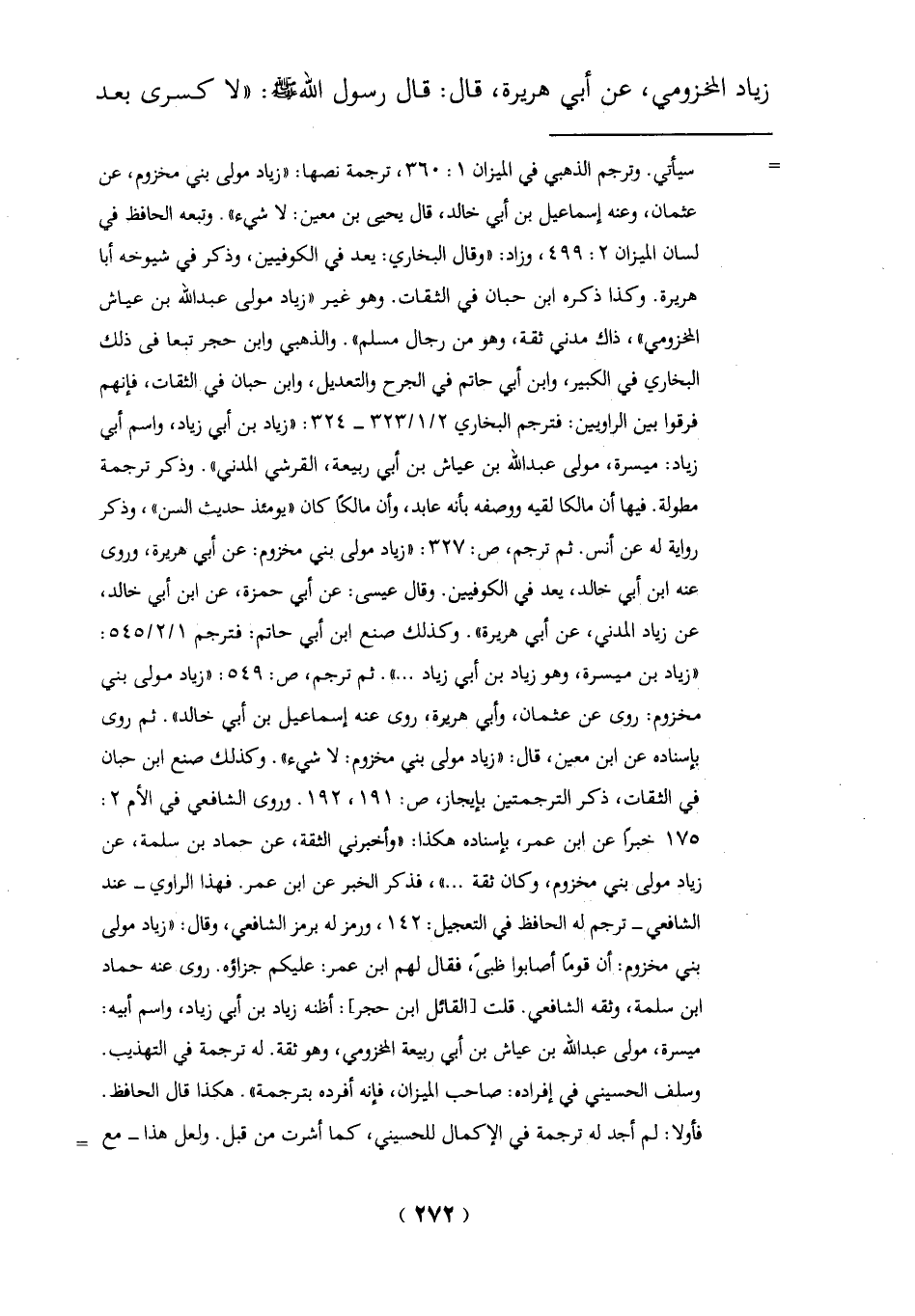 = سيأتي. وترجم الذهبي في الميزان 1: 360، ترجمة نصها: "زياد مولى بني مخزوم، عن عثمان، وعنه إسماعيل بن أبي خالد، قال يحيى بن معين: لا شيء". وتبعه الحافظ في لسان الميزان 2: 499، وزاد: "وقال البخاري: يعد في الكوفيين، وذكر في شيوخه أبا هريرة. وكذا ذكره ابن حبان في الثقات. وهو غير "زياد مولى عبد الله بن عياش المخزومي"، ذاك مدني ثقة، وهو من رجال مسلم". والذهبي وابن حجر تبعاً في ذلك البخاري في الكبير، وابن أبي حاتم في "الجرح والتعديل" وابن حبان في الثقات، فإنهم فرقوا بين الراويين: فترجم البخاري 2/ 1/323 - 324: "زياد بن أبي زياد، واسم أبي زياد: ميسرة، مولى عبد الله بن عياش بن أبي ربيعة، القرشي المدني". وذكر ترجمة مطولة. فيها أن مالكا لقيه ووصفه بأنه عابد، وأن مالكا كان "يومئذ حديث السنن"، وذكر رواية له عن أنس. ثم ترجم، ص: 327: "زياد مولى بني مخزوم: عن أبي هريرة، وروى عنه ابن أبي خالد، يعد في الكوفيين. وقال عيسى: عن أبي حمزة، عن ابن أبي خالد، عن زياد المدني، عن أبي هريرة". وكذلك صنع ابن أبي حاتم: فترجم 1/ 2/545: "زياد بن ميسرة، وهو زياد بن أبي زياد ... ". ثم ترجم، ص: 549: "زياد مولى بني مخزوم: روى عن عثمان، وأبي هريرة، روى عنه إسماعيل بن أبي خالد". ثم روى بإسناده عن ابن معين، قال: "زياد مولى بني مخزوم: لا شيء". وكذلك صنع ابن حبان في الثقات، ذكر الترجمتين بإيجاز، ص: 191، 192. وروى الشافعي في الأم 2: 175 خبرًا عن ابن عمر، بإسناده هكذا: "وأخبرنى الثقة، عن حمّاد بن سلمة، عن زياد مولى بني مخزوم، وكان ثقة ... "، فذكر الخبر عن ابن عمر. فهذا الراوي - عند الشافعي- ترجم له الحافظ في التعجيل: 142، ورمز له برمز الشافعي، وقال: "زياد مولى بني مخزوم: أن قومًا أصابوا ظبىً، فقال لهم ابن عمر: عليكم جزاؤه. روى عنه حمّاد