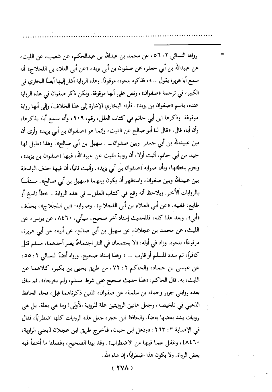 = رواها النسائي 2: 56، عن محمَّد بن عبد الله بن عبد الحكم، عن شُعيب، عن الليث، عن عُبيد الله بن أبي جعفر، عن صفوان بن أبي يزيد، "عن أبي العلاء بن اللجلاج" أنه سمع أبا هريرة يقول ... "، فذكره بنحوه، موقوفًا. وهذه الرواية أشار إليها أيضاً البخاري في الكبير، في ترجمة "صفوان"، ونص على أنها موقوفة. ولكن ذكر صفوان في هذه الرواية عنده، باسم "صفوان بن يزيد". فأراد البخاري الإشارة إلى هذا الخلاف، وإلى أنها رواية موقوفة. وذكرها ابن أبي حاتم في كتاب العلل، رقم: 909، وأنه سمع أباه يذكرها، وأن أباه قال: "قال لنا أبو صالح عن الليث، وإنما هو "صفوان بن أبي يزيد" وأرى أن بين عُبيد الله بن أبي جعفر ولين صفوان -: سهيل بن أبي صالح". وهذا تعليل لها جيد من أبي حاتم: أثبت أولاً: أن رواية الليث عن عُبيد الله، فيها "صفوان بن يزيد"، وجزم بخطئها، وبأن صوابه "صفوان بن أبي يزيد". وأثبت ثانيًا: أن فيها حذف الواسطة بين عُبيد الله وبين صفوان، واستظهر أن يكون بينهما "سهيل بن أبي صالح". مستأنسًا بالروايات الآخر. ويلاحظ أنه وقع في كتاب العلل - في هذه الرواية- خطأ ناسخ أو طابع: ففيه: "عن أبي العلاء بن أبي اللجلاج". وصوابه: "بن اللجلاج"، بحذف "أبي". وبعد هذا كله، فللحديث إسناد آخر صحيح، سيأتي: 8460، عن يونس، عن الليث، عن محمَّد بن عجلان، عن سهيل بن أبي صالح، عن أبيه، عن أبي هريرة، مرفوعًا، بنحوه. وزاد في أوله: "لا يجتمعان في النار اجتماعًا يضر أحدهما، مسلم قتل كافرًا، ثم سدد المسلم أو قارب ... " وهذا إسناد صحيح. ورواه أيضاً النسائي 2: 55، عن عيسى بن حمّاد، والحاكم 2: 72، من طريق يحيى بن بكير، كلاهما عن الليث، به. قال الحاكم: "هذا حديث صحيح على شرحًا مسلم، ولم يخرجاه". ثم ساق بعده روايتي جرير وحماد بن سلمة، عن صفران، اللتين ذكرناهما قبل، فجاء الحافط الذهبي في تلخيصه، وجعل هاتين الروايتين علة للرواية الأولى! وما هي بعلة. بل هي روايات يشد بعضها بعضًا. والحافظ ابن حجر، جعل هذه الروايات كلها اضطرابًا، فقال في الإصابة 3: 263: "وذهل ابن حبان، فأخرج طريق ابن عجلان [يعني الراية: 8460]، وغفل عما فيها من الاضطراب". وقد بينا الصحيح، وفصلنا ما أخطأ فيه بعض الرواة. ولا يكون هذا اضطرابًا، إن شاء الله.