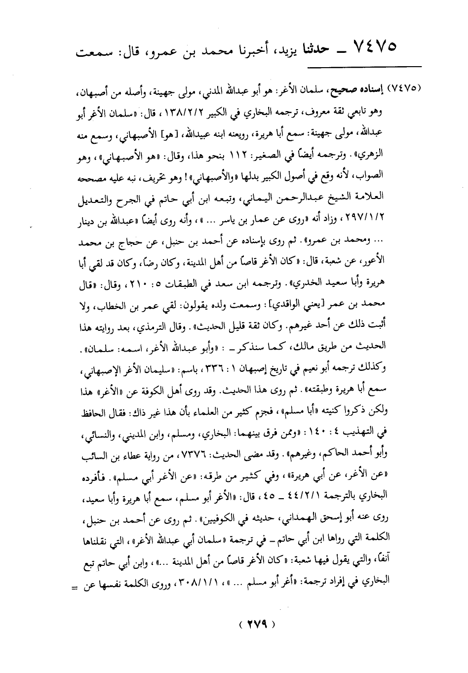 وكذلك ترجمه أبو نعيم في تاريخ إصبهان 1: 336، باسم: "سليمان الأغر الإصبهاني، سمع أبا هريرة وطبقته". ثم روى هذا الحديث. وقد روى أهل الكوفة عن "الأغر" هذا ولكن ذكروا كنيته "أبا مسلم"، فجزم كثير من العلماء بأن هذا غير ذاك: فقال الحافظ في التهذيب 4: 140: "وممن فرق بينهما: البخاري، ومسلم، وابن المديني، والنسائي، وأبو أحمد الحاكم، وغيرهم". وقد مضى الحديث: 7376، من رواية عطاء بن السائب "عن الأغر، عن أبي هريرة"، وفي كثير من طرقه: "عن الأغر أبي مسلم". فأفرده البخاري بالترجمة 1/ 2/44 - 45، قال: "الأغر أبو مسلم، سمع أبا هريرة وأبا سعيد، روى عنه أبو إسحق الهمداني، حديثه في الكوفيين". ثم روى عن أحمد بن حنبل، الكلمة التي رواها ابن أبي حاتم - في ترجمة "سلمان أبي عبد الله الأغر"، التي نقلناها آنفًا، والتي يقول فيها شُعبة: "كان الأغر قاصاً من أهل المدينة ... "، وابن أبي حاتم تبع البخاري في إفراد ترجمة: "أغر أبو مسلم ... "، 1/ 1/ 308، وروى الكلمة نفسها عن =