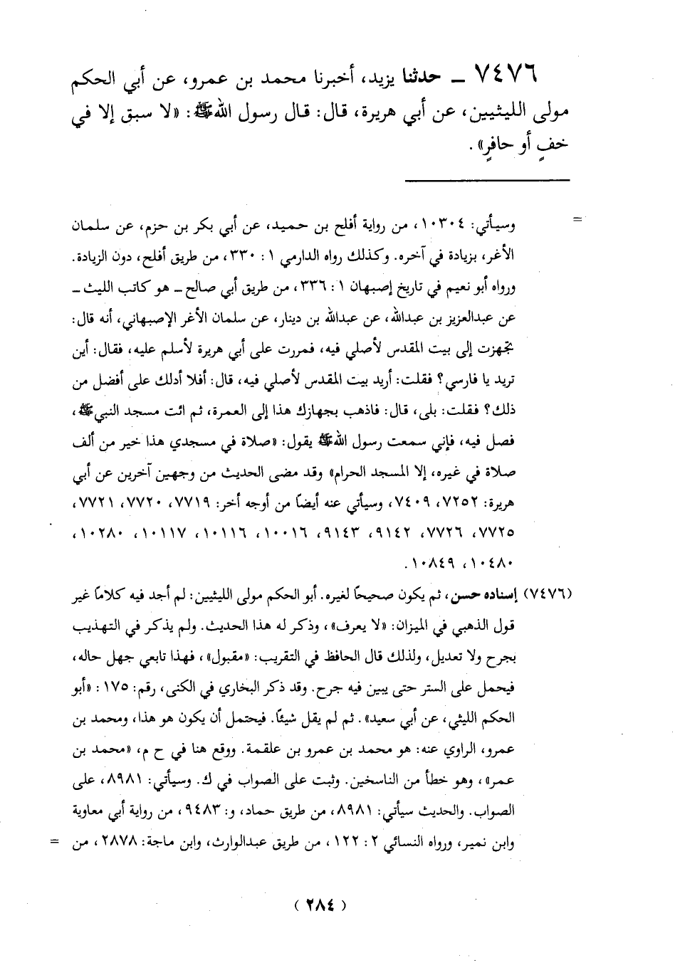 7476 - حدثنا يزيد، أخبرنا محمَّد بن عمرو، عن أبي الحكم مولى الليثيين، عن أبي هريرة، قال: قال رسول الله -صلي الله عليه وسلم -: "لا سبق إلا في خفٍ أو حافرٍ".