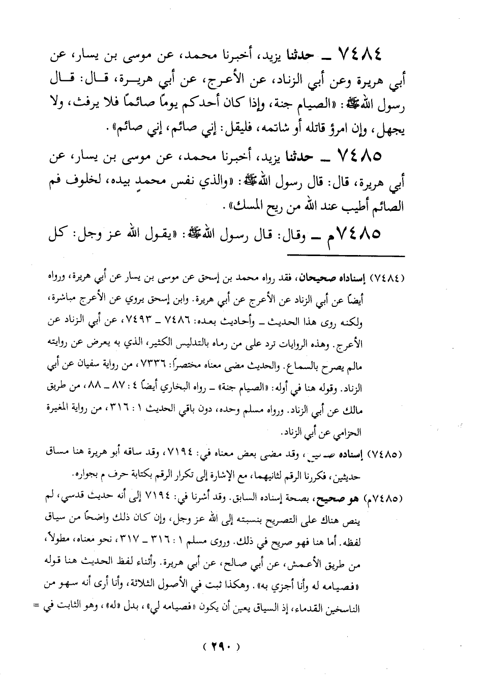 (7484) إسناداه صحيحان، فقد رواه محمَّد بن إسحق عن موسى بن يسار عن أبي هريرة، ورواه