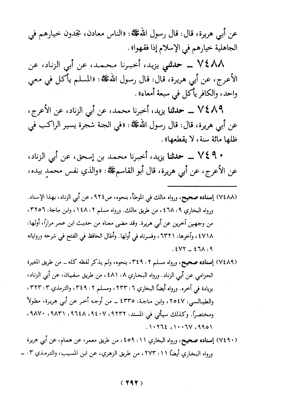 (7490) إسناده صحيح، ورواه البخاري 11: 459، من طريق معمر، عن همام، عن أبي هريرة ورواه البخاري أيضاً 11: 273، من طريق الزهري، عن ابن المسيب، والترمذي 3: =