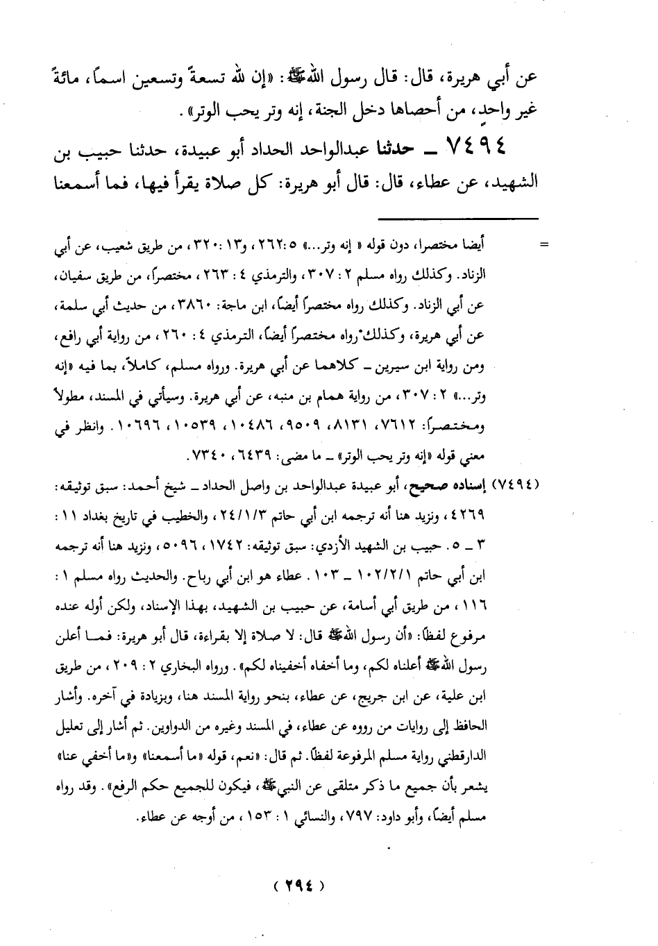 عن أبي هريرة، قال: قال رسول الله -صلي الله عليه وسلم -: "إن لله تسعة وتسعين اسماً، مائةً غير واحدٍ، من أحصاها دخل الجنة، إنه وتر يحب الوتر".