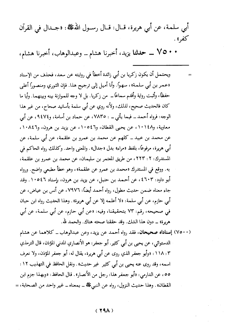 = ويحتمل أن يكون زكريا بن أبي زائدة أخطأ في روايته عن سعد، فحذف من الإِسناد "عمر بن أبي سلمة"، سهواً. وأنا أميل إلى ترجيح هذا. فإن الثوري ومنصورًا أعلى حفظًا، وأثبت رواية وأقدم سماعاً - من زكريا. بل لا وجه للموازنة بينه وبينهما. وأيا ما كان فالحديث صحيح، لذلك، ولأنه روي عن أبي سلمة بأسانيد صحاح، من غير هذا الوجه: فرواه أحمد - فيما يأتي-: 7835، عن حمّاد بن أسامة، و 9474، عن أبي معاوية، و 10148، عن يحيى القطان، و10546، عن يزيد بن هرون، و10846، عن محمَّد بن عبيد - كلهم عن محمَّد بن عمرو بن علقمة، عن أبي سلمة، عن