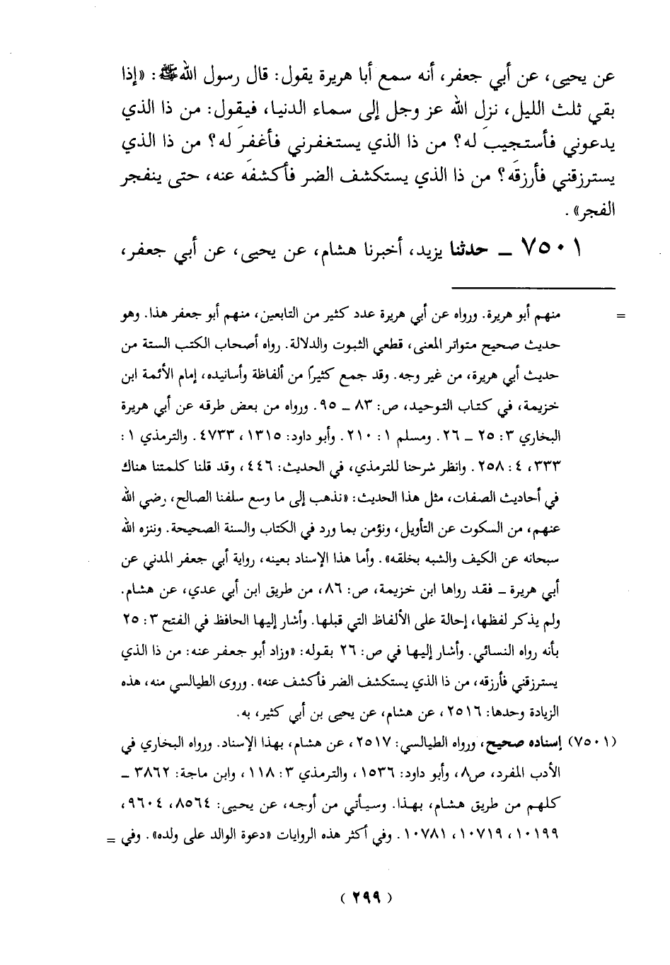 = منهم أبو هريرة. ورواه عن أبي هريرة عدد كثير من التابعين، منهم أبو جعفر هذا. وهو حديث صحيح متواتر المعنى، قطعي الثبوت والدلالة. رواه أصحاب الكتب الستة من حديث أبي هريرة، من غير وجه. وقد جمع كثيرًا من ألفاظة وأسانيده، إمام الأئمة ابن خزيمة، في كتاب التوحيد، ص: 83 - 95. ورواه من بعض طرقه عن أبي هريرة البخاري 3: 25 - 26. ومسلم 1: 210. وأبو داود: 1315، 4733. والترمذي 1: 333، 4: 258. وانظر شرحنا للترمذي، في الحديث: 446، وقد قلنا كلمتنا هناك في أحاديث الصفات، مثل هذا الحديث: "نذهب إلى ما وسع سلفنا الصالح، رضى الله عنهم، من السكوت عن التأويل، ونؤمن بما ورد في الكتاب والسنة الصحيحة. وننزه الله