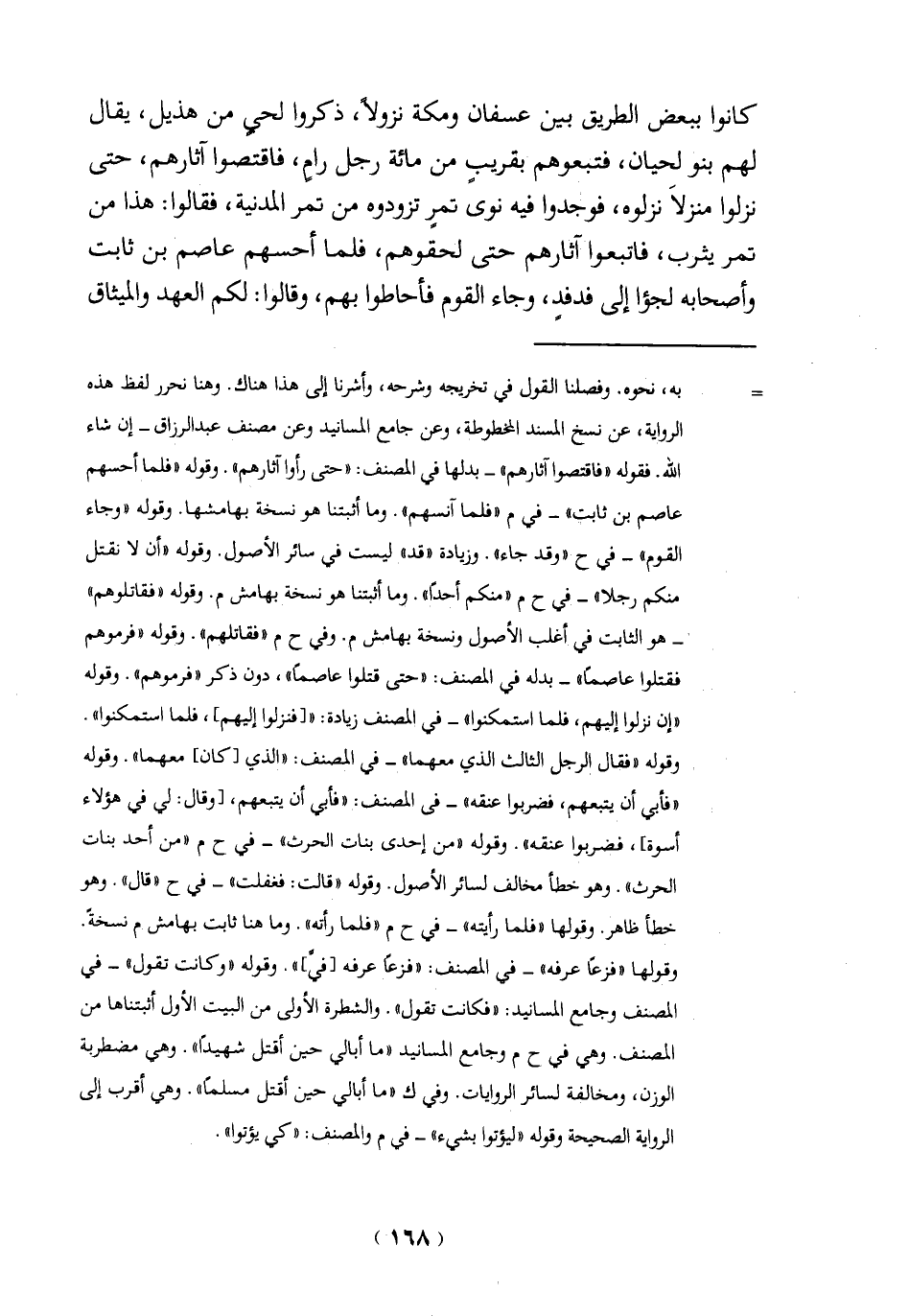 = به، نحوه. وفصلنا القول في تخريجه وشرحه، وأشرنا إلى هذا هناك. وهنا نحرر لفظ هذه الرواية" عن نسخ المسند المخطوطة، وعن جامع المسانيد وعن مصنف عبد الرزاق -إن شاء الله. فقوله "فاقتصوا آثارهم" - بدلها في المصنف: "حتى رأوا آثارهم". وقوله "فلما أحسهم عاصم بن ثابت" - في م "فلما آنسهم". وما أثبتنا هو نسخة بهامشها. وقوله "وجاء القوم" - في ح "وقد جاء". وزيادة "قد" ليست في سائر الأصول. وقوله" أن لا نقتل منكم رجلا"- في ح م "منكم أحدًا". وما أثبتنا هو نسخة بهامش م. وقوله "فقاتلوهم" - هو الثابت في أغلب الأصول ونسخة بهامش م. وفي ح م "فقاتلهم". وقوله "فرموهم فقتلوا عاصمًا" - بدله في المصنف: "حتى قتلوا عاصمًا، دون ذكر "فرموهم". وقوله
