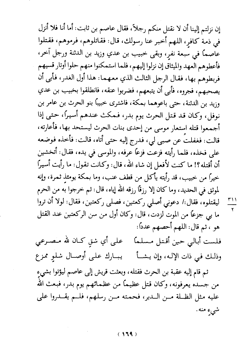 فربطوهم بها، فقال الرجل الثالث الذي معهما: هذا أول الغدر، فأبى أن يصحبهم، فجروه، فأبى أن يتبعهم، فضربوا عنقه، فانطلقوا بخبيب بن عدي وزيد بن الدثنة، حتى باعوهما بمكة، فاشترى خبيباً بنو الحرث بن عامر بن نوفل، وكان قد قتل الحرث يوم بدر، فمكث عندهم أسيرًا، حتى إذا أجمعوا قتله استعار موسى من إحدى بنات الحرث ليستحد بها، فأعارته، قالت: فغفلتُ عن صبي لي، فدر إليه حتى أتاه، قالت: فأخذه فوضعه على فخذه، فلما رأيته فزعت فزعًا عرفه، والموسى في يده، فقال: أتخشين