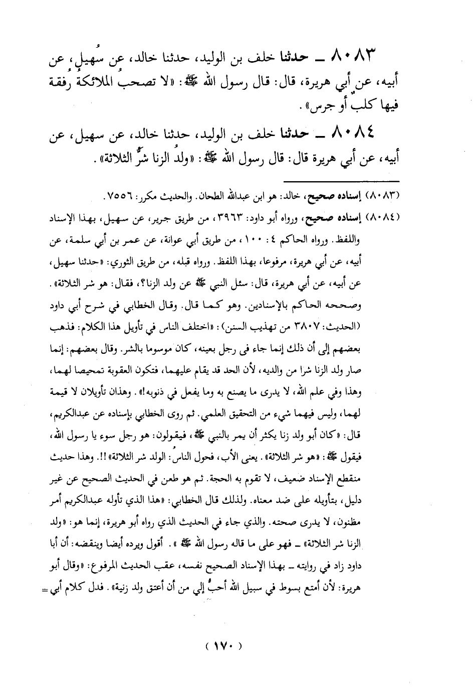 8084 - حدثنا خلف بن الوليد، حدثنا خالد، عن سهيل، عن أبيه، عن أبي هريرة قال: قال رسول الله -صلي الله عليه وسلم -: "ولدُ الزنا شَرُّ الثلاثة".
