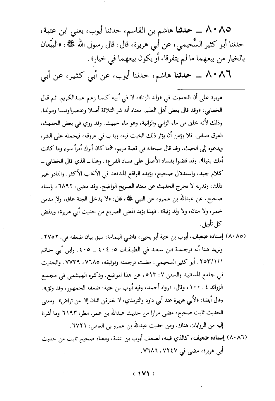 8085 - حدثنا هاشم بن القاسم، حدثنا أيوب، يعني ابن عتبة، حدثنا أبو كثير السُّحيمي، عن أبي هريرة، قال: قال رسول الله - صلي الله عليه وسلم-: "البَيّعان بالخيار من بيعهما ما لم يتفرقا، أويكون بيعهما في خيار".