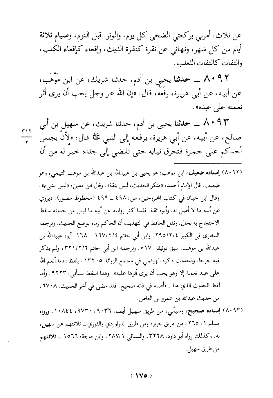 8092 - حدثنا يحِيِى بن آدم، حدثنا شريك، عن ابن مَوْهَب، عن أبيه، عن أبي هريرة، رفَعَهُ، قال: "إن الله عَزَّ وَجَلَّ يحب أن يرى أثر نعمته على عبده".