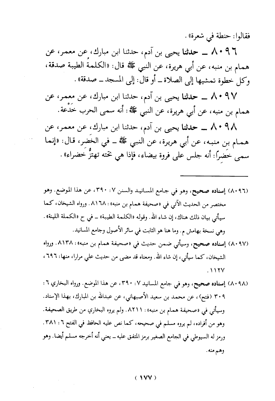 8096 - حدثنا يحيى بن آدم، حدثنا ابن مبارك، عن معمر، عن همام بن منبه، عن أبي هريرة، عن النبي -صلي الله عليه وسلم - قال: "الكلمةُ الطيبة صدقة، وكل خطوة تمشيها إلى الصلاة- أو قال: إلى المسجد - صدقة".