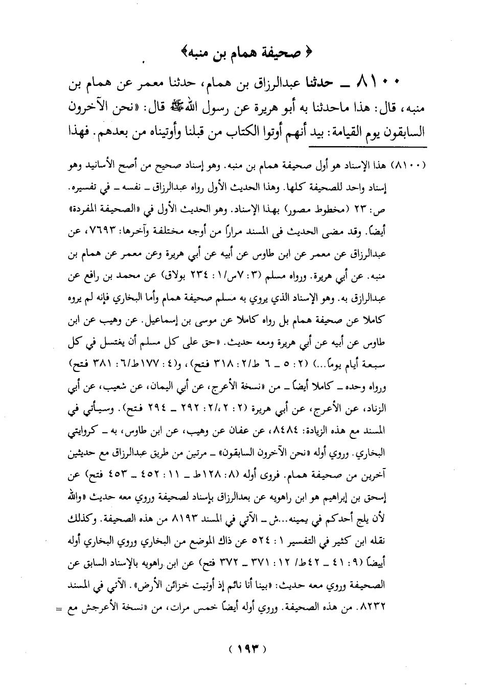 (8100) هذا الإسناده هو أول صحيفة همام بن منبه. وهو إسناد صحيح من أصح الأسانيد وهو إسناد واحد للصحيفة كلها. وهذا الحديث الأول رواه عبد الرزاق - نفسه- في تفسيره.