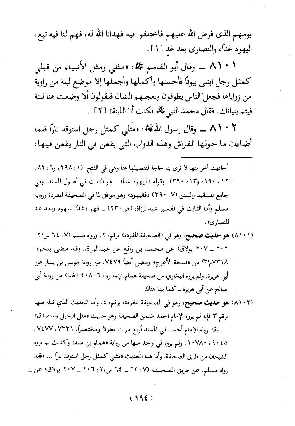 (8102) هو حديث صحيح، وهو في الصحيفة المفردة، برقم: 4. وأما الحديث الذي قبله فيها برقم 3 فإنه لم يروه الإِمام أحمد ضمن الصحيفة وهو حديث "مثل البخيل والتصدق" ... وقد رواه الإِمام أحمد في المسند أربع مرات مطولاً ومختصرًا: 7331، 7477، 9045، 10780، ولم يروه في واحد منها من رواية "همام بن منبه" وكذلك لم يروه الشيخان من طريق الصحيفة. وأما هذا الحديث "مثلي كمثل رجل اعتوقد نارًا ... "فقد رواه مسلم. عن طريق الصحيفة (7: 63 - 64 س/2: 206 - 207 بولاق) عن =
