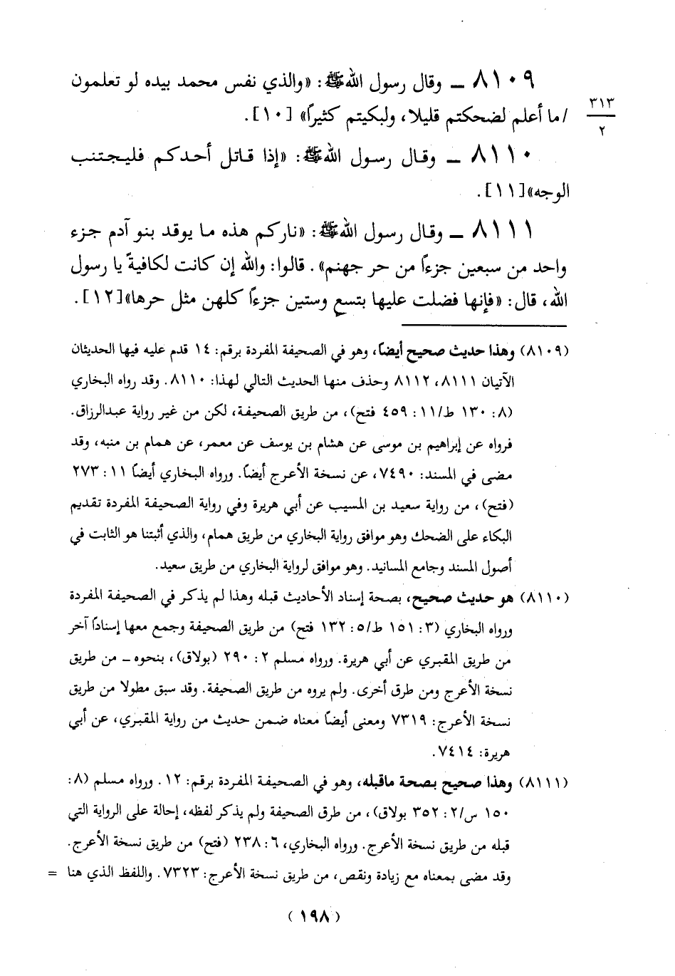 (8111) وهذا صحيح بصحة ما قبله، وهو في الصحيفة المفردة برقم: 12. ورواه مسلم (8: 150 س/2: 352 بولاق)، من طرق الصحيفة ولم يذكر لفظه، إحالة على الرواية التي قبله من طريق نسخة الأعرج. ورواه البخاري، 6: 238 (فتح) من طريق نسخة الأعرج.