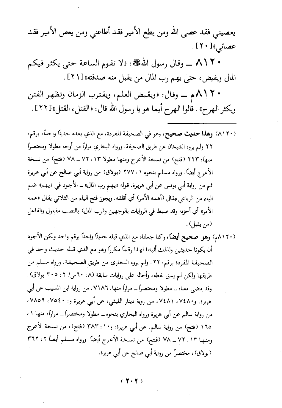 8120 م - وقال: "ويقبض العلم، ويقترب الزمان وتظهر الفتن ويكثر الهرج". قالوا الهرج أيما هو يا رسول الله قال: "القتل، القتل" [22].