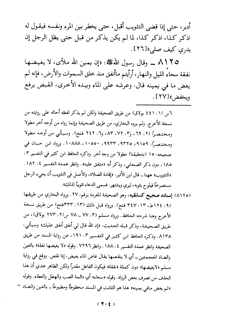8125 - وقال رسول الله - صلى الله عليه وسلم -: "إن يمين الله ملأى، لا يغيضها نفقة سحاء الليل والنهار، أرأيتم ما أنفق منذ خلق السموات والأرض، فإنه لم يغض ما في يمينه قال: وعرشه على الماء وبيده الأخرى، القبض يرفع ويخفض" [27].