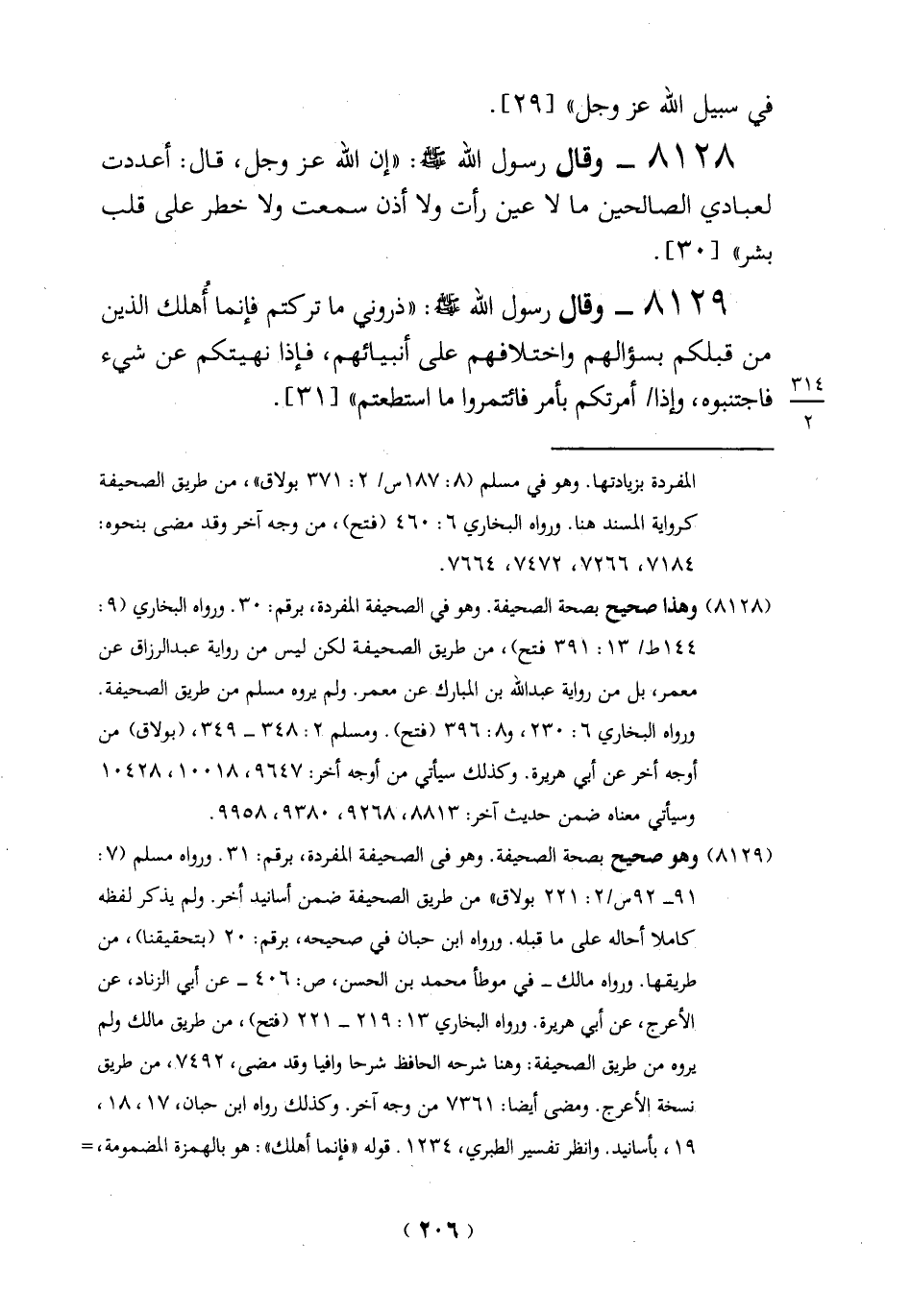 8129 - وقال رسول الله - صلى الله عليه وسلم -: "ذروني ما تركتم فإنما أُهلك الذين من قبلكم بسؤالهم واختلافهم على أنبيائهم، فإذا نهيتكم عن شيء فاجتنبوه، وإذا أمرتكم بأمر فائتمروا ما استطعتم" [31].