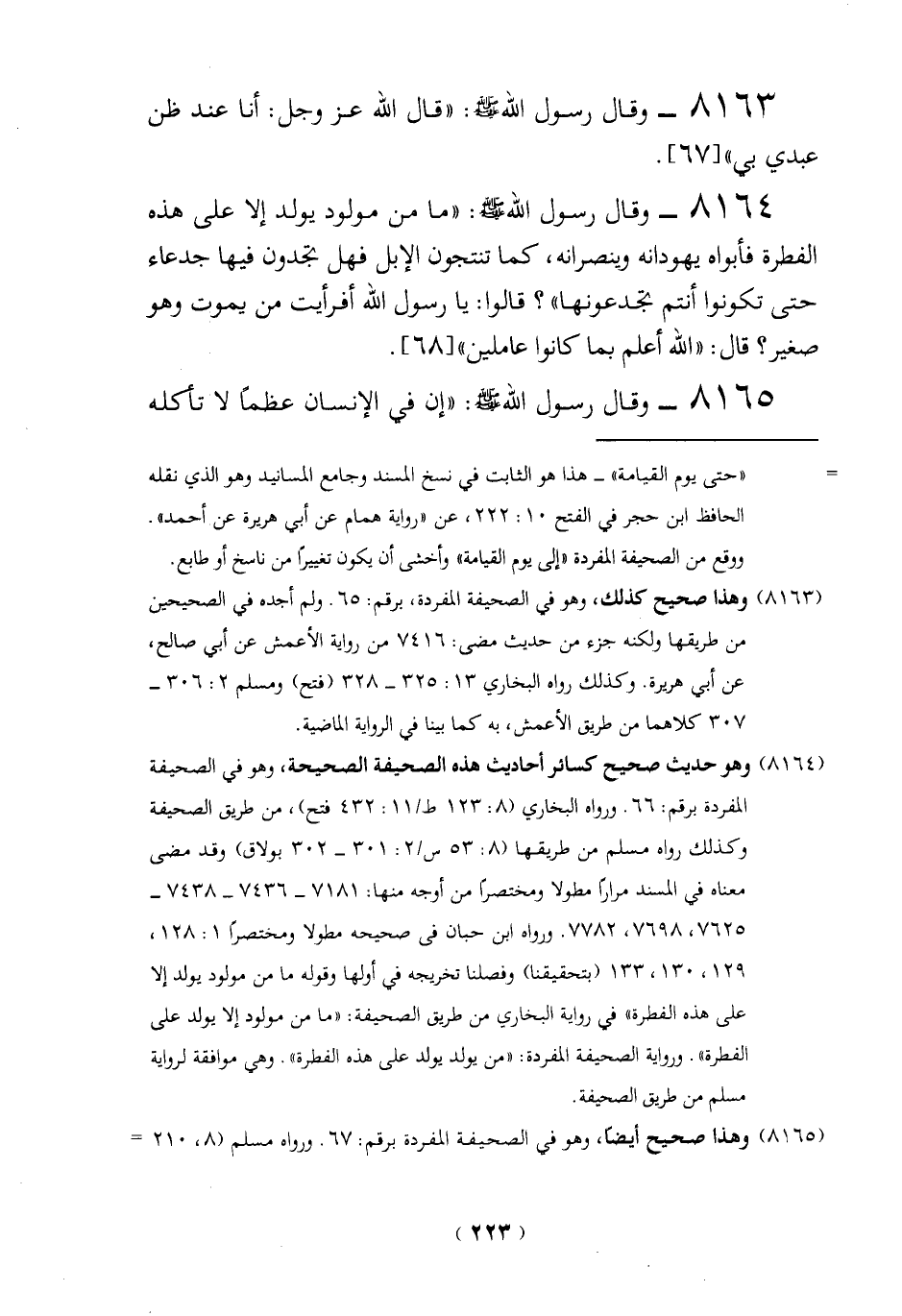 (8164) وهو حديث صحيح كسائر أحاديث هذه الصحيفة الصحيحة، وهو في الصحيفة المفردة برقم: 66. ورواه البخاري (8: 123 ط / 11: 432 فتح)، من طريق الصحيفة وكذلك رواه مسلم من طريقها (8: 53 س/2: 301 - 302 بولاق) وقد مضى معناه في المسند مراراً مطولاً ومختصراً من أوجه منها: 7181 - 7436 - 7438 - 7625، 7698، 7782. ورواه ابن حبان في صحيحه مطولاً ومحتصرًا 1: 128، 129، 130، 133 (بتحقيقنا) وفصلنا تخريجه في أولها وقوله ما من مولود يولد إلا على هذه الفطرة" في رواية البخاري من طريق الصحيفة: "ما من مولود إلا يولد على الفطرة". ورواية الصحيفة المفردة: "من يولد يولد على هذه الفطرة". وهي موافقة لرواية مسلم من طريق الصحيفة.
