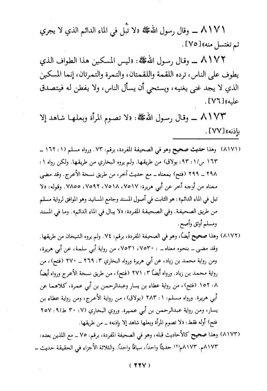 (8171) وهذا حديث صحيح وهو في الصحيفة المفردة، برقم: 73. ورواه مسلم (1: 162 - 163 س/1: 93: بولاق) من طريقها. ولم يروه البخاري من طريقها. ولكن رواه 1: 298 - 299 (فتح) بمعناه - مع حديث آخر، من طريق نسخة الأعرج. وقد مضى معناه من أوجه أخر عن أبي هريرة: 7517، 7518، 7592، 7855. وقوله: "لا تبل في الماء الدائم": هو الثابت في أصول المسند وجامع المسانيد وهو الموافق لرواية مسلم من طريق الصحيفة. وفي الصحيفة المفردة: "لا يبال في الماء الدائم". وما في المسند ومسلم أوثق وأصح.
