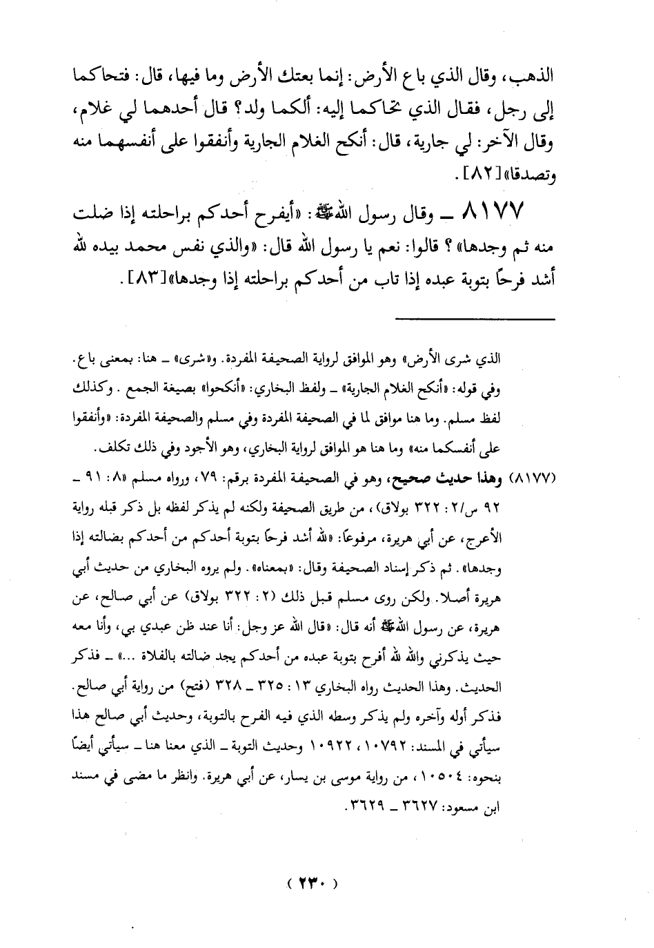 8177 - وقال رسول الله - صلى الله عليه وسلم -: "أيفرح أحدكم براحلته إذا ضلت منه ثم وجدها"؟ قالوا: نعم يا رسول الله قال: "والذي نفس محمَّد بيده لله أشد فرحًا بتوبة عبده إذا تاب من أحدكم براحلته إذا وجدها" [83].