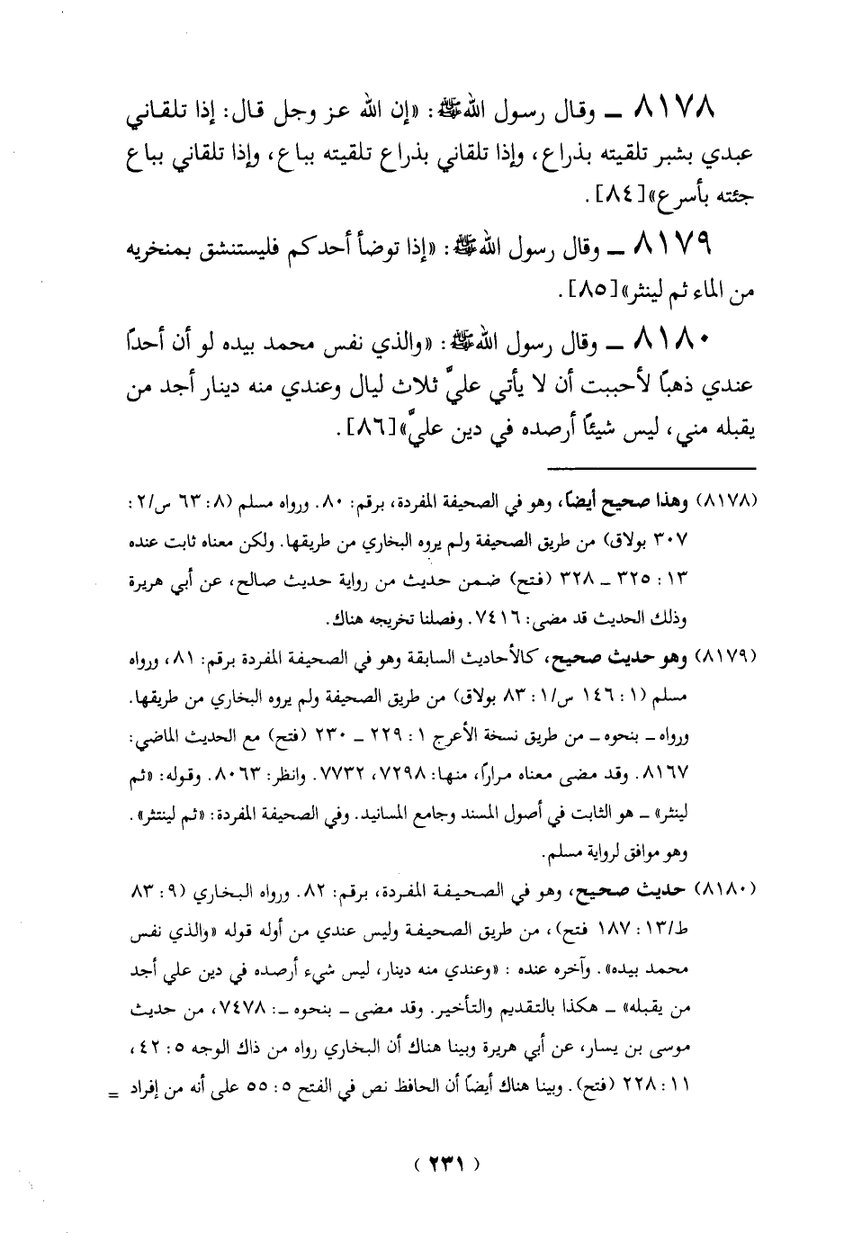 8178 - وقال رسول الله - صلى الله عليه وسلم -: "إن الله عَزَّ وَجَلَّ قال: إذا تلقاني عبدي بشبر تلقيته بذراع، وإذا تلقاني بذراع تلقيته بباع، وإذا تلقاني بباع جئته بأسرع" [84].