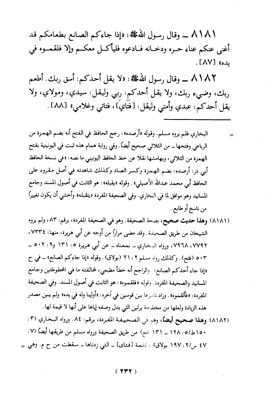 8182 - وقال رسول الله - صلى الله عليه وسلم -: "لا يقل أحدكم: أسق ربك. أطعم ربك، وضيء ربك، ولا يقل أحدكمٍ: رِبي وليقل: سيدي، ومولاي، ولا يقل أحدكم: عبدي وأمتي وليقل: [فَتَايَ]، فتاتى وغلامي" [88].
