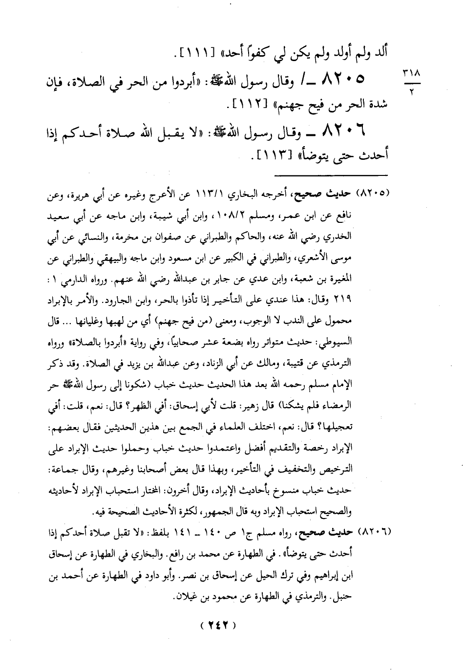 8205 - وقال رسول الله - صلى الله عليه وسلم -: "أبردوا من الحر في الصلاة فإن شدة الحر من فيح جهنم" [112].