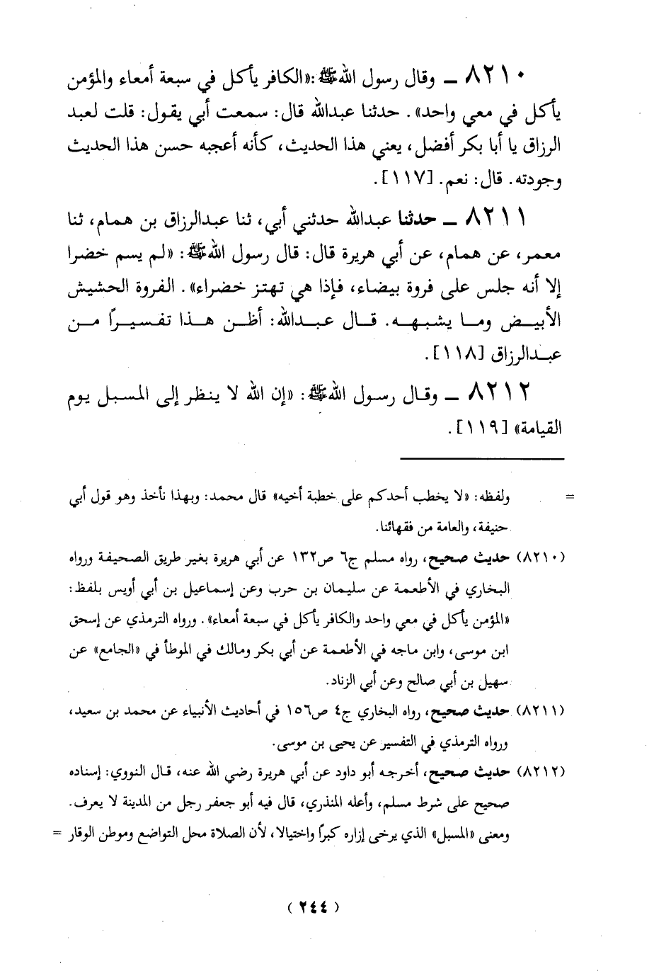 8210 - وقال رسول الله - صلى الله عليه وسلم -: "الكافر يأكل في سبعة أمعاء والمؤمن يأكل في معي واحد". حدثنا عبد الله قال: سمعت أبي يقول: قلت لعبد الرزاق يا أبا بكر أفضل، يعني هذا الحديث، كأنه أعجبه حسن هذا الحديث وجودته. قال: نعم. [117].