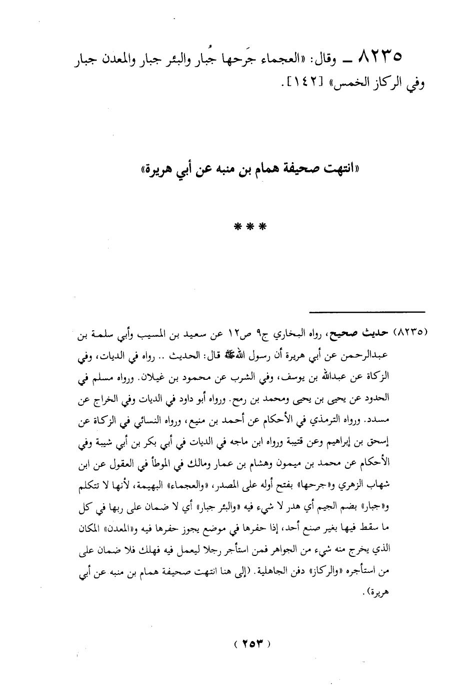 و"جبار" بضم الجيم أي هدر لا شيء فيه "والبئر جبار" أي لا ضمان على ربها في كل ما سقط فيها بغير صنع أحد، إذا حفرها في موضع يجوز حفرها فيه و"المعدن" المكان الذي يخرج منه شيء من الجواهر فمن استأجر رجلا ليعمل فيه فهلك فلا ضمان على من استأجره "والركاز" دفن الجاهلية. (إلى هنا أنتهت صحيفة همام بن منبه عن أبي هريرة).