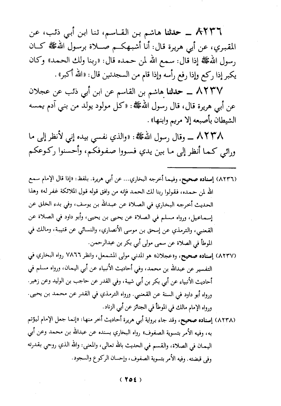 (8238) إسناده صحيح، وقد جاء برواية أبي هريرة أحاديث أخر منها: "إنما جعل الإِمام ليؤتم به، وفيه الأمر بتسوية الصفوف" رواه البخاري بسنده عن عبد الله بن محمَّد وعن أبي اليمان في الصلاة، والقسم في الحديث بالله تعالى، والمعنى: والله الذي روحي بقدرته وفي قبضته. وفيه الأمر بتسوية الصفوف، وإحسان الركوع والسجود.