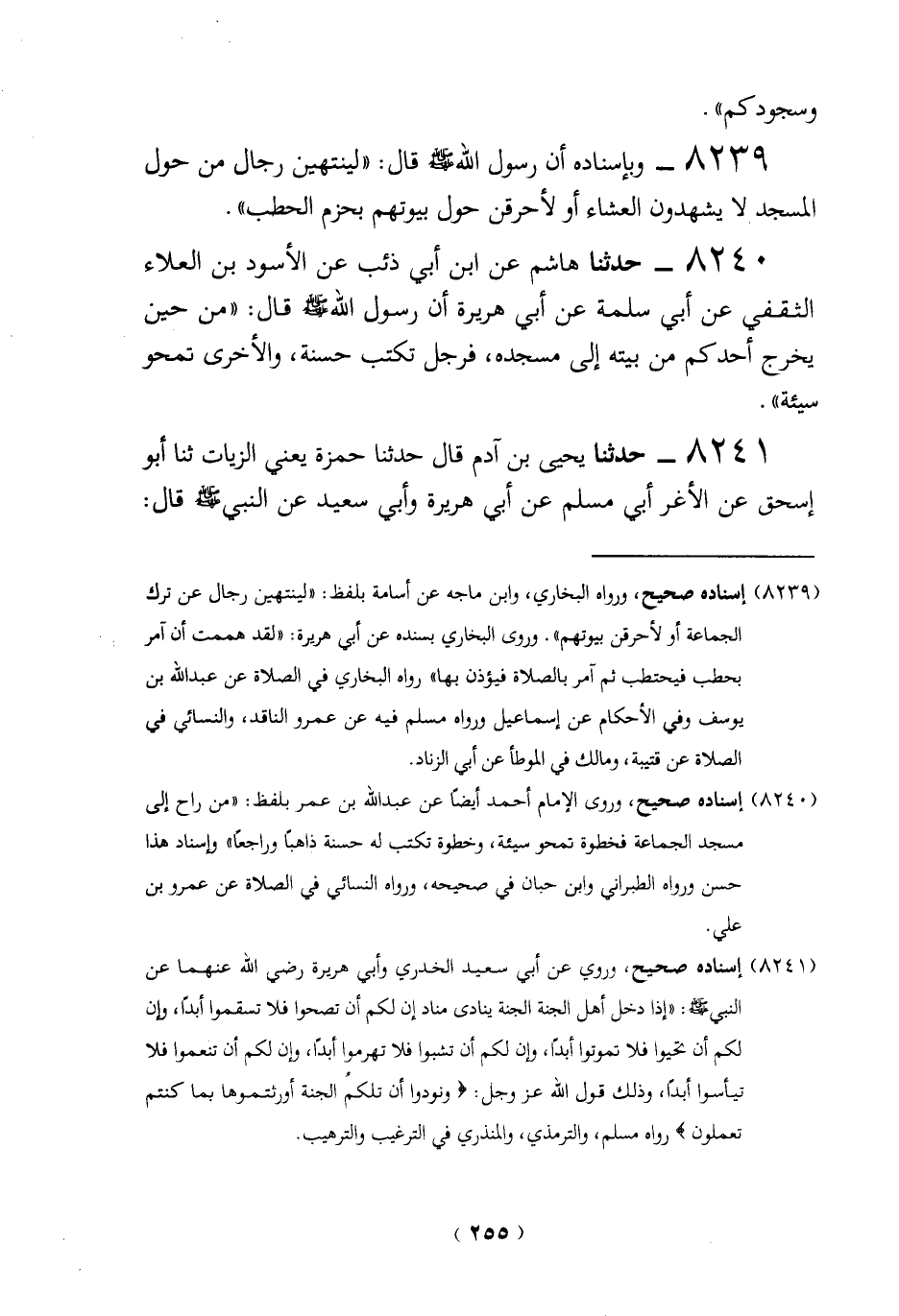 (8239) إسناده صحيح، ورواه البخاري، وابن ماجه عن أسامة بلفظ: "لينتهين رجال عن ترك الجماعة أو لأحرقن ببوتهم". وروى البخاري بسنده عن أبي هريرة: "لقد هممت أن آمر بحطب فيحتطب ثم آمر بالصلاة فيؤذن بها" رواه البخاري في الصلاة عن عبد الله بن يوسف وفي الأحكام عن إسماعيل ورواه مسلم فيه عن عمرو الناقد، والنسائي في الصلاة عن قتيبة، ومالك في الموطأ عن أبي الزناد.