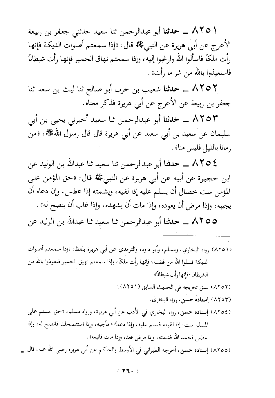 8251 - حدثنا أبو عبد الرحمن ثنا سعيد حدثني جعفر بن ربيعة الأعرج عن أبي هريرة عن النبي -صلي الله عليه وسلم - قال: "إذا سمعتم أصوات الديكة فإنها رأت ملكًا فاسألوا الله وارغبوا إليه، وإذا سمعتم نهاق الحمير فإنها رأت شيطانًا فاستعيذوا بالله من شر ما رأت".
