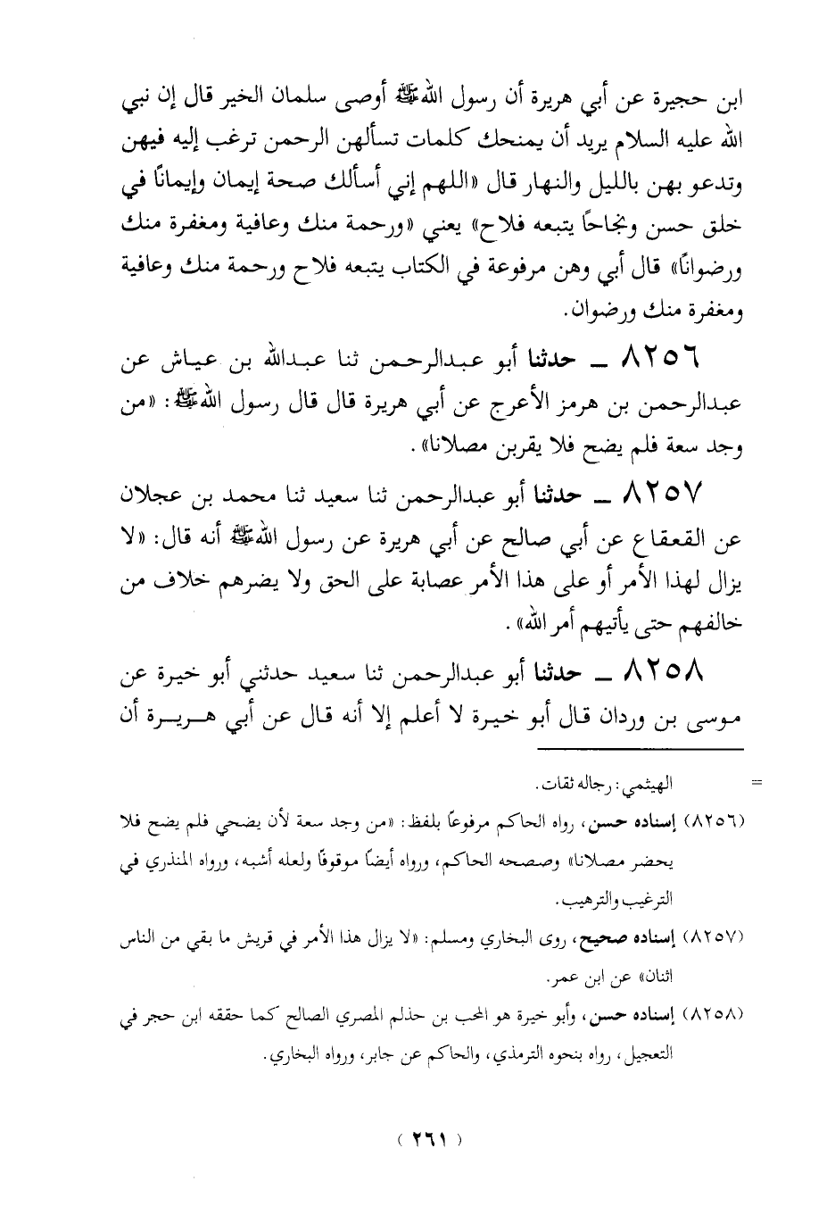 8257 - حدثنا أبو عبد الرحمن ثنا سعيد ثنا محمَّد بن عجلان عن القعقاع عن أبي صالح عن أبي هريرة عن رسول الله - صلى الله عليه وسلم - أنه قال: "لا يزال لهذا الأمر أو على هذا الأمر عصابة على الحق ولا يضرهم خلاف من خالفهم حتى يأتيهم أمر الله".