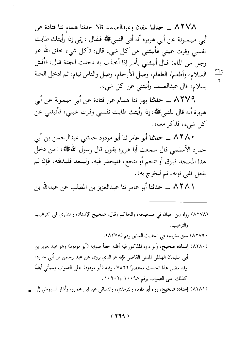 (8280) إسناده صحيح، وأبو داود المذكور فيه أظنه خطأ صوابه (أبو مودود) وهو عبد العزيز بن
